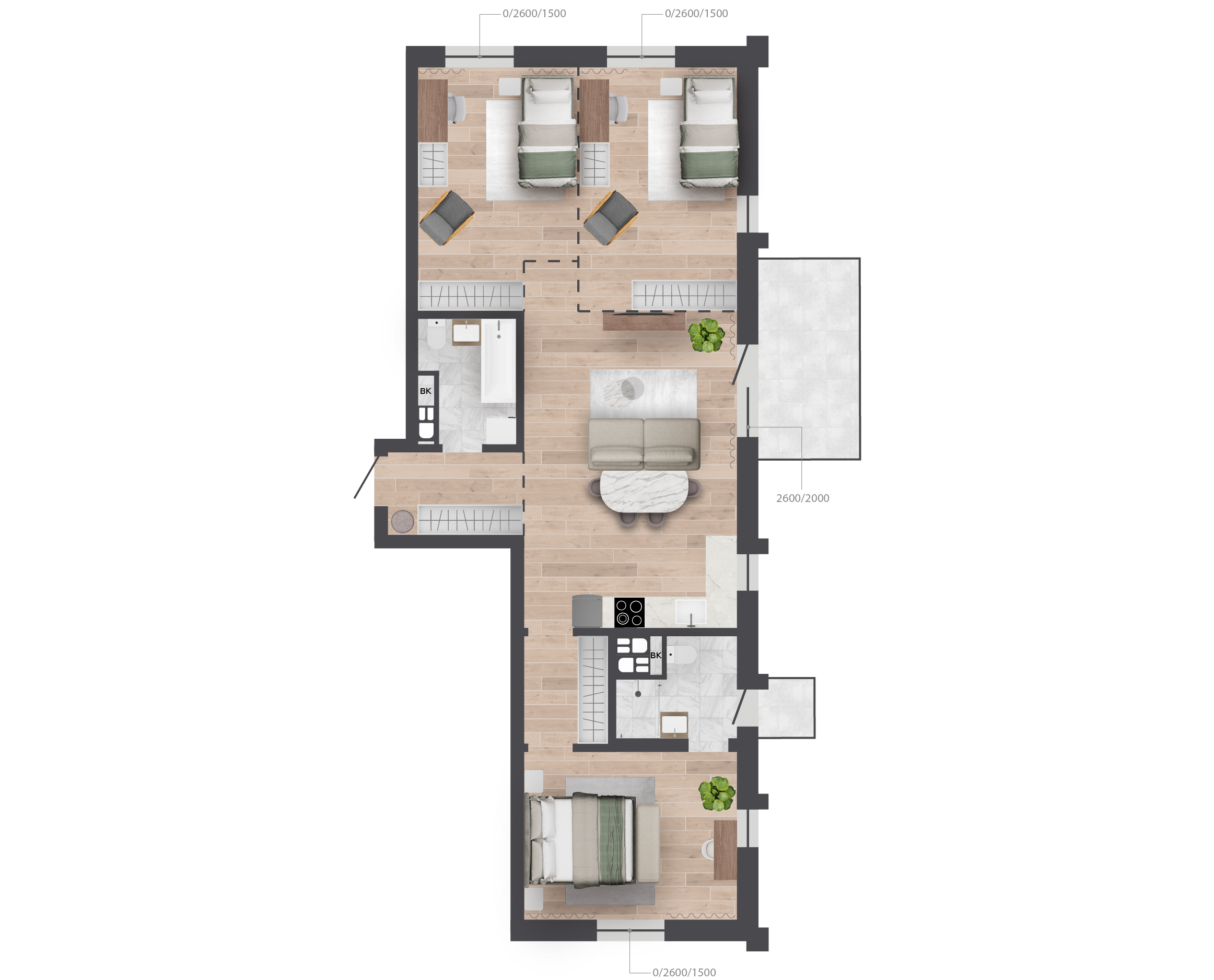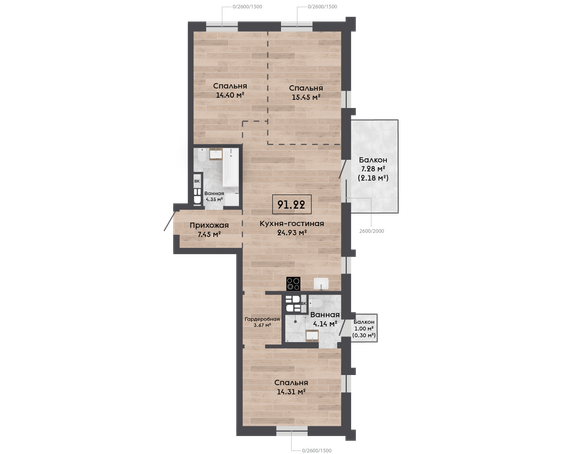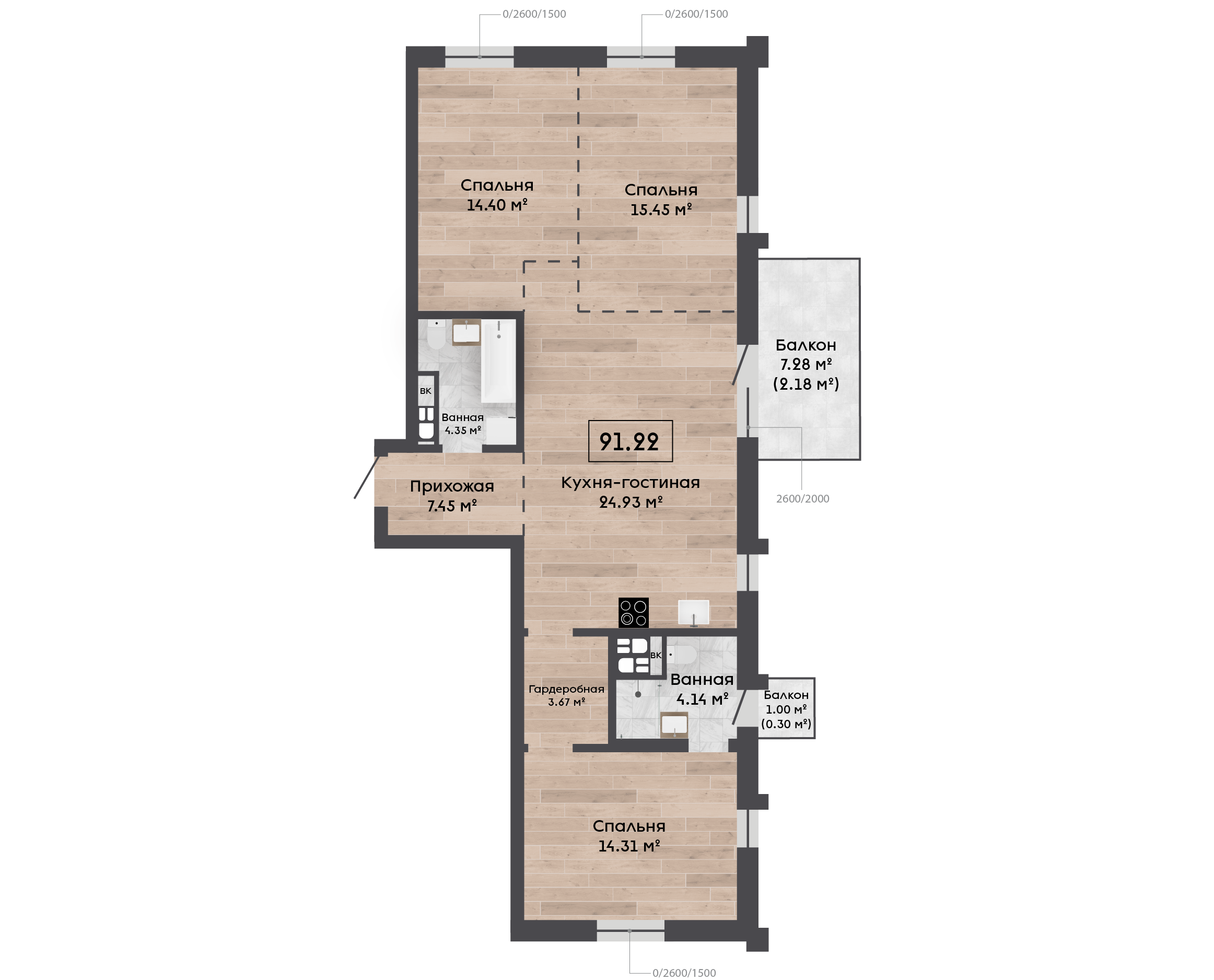 | 91,22 м² Площадь квартиры | 3 м Высота потолков | 7,28 м² Площадь балкона |