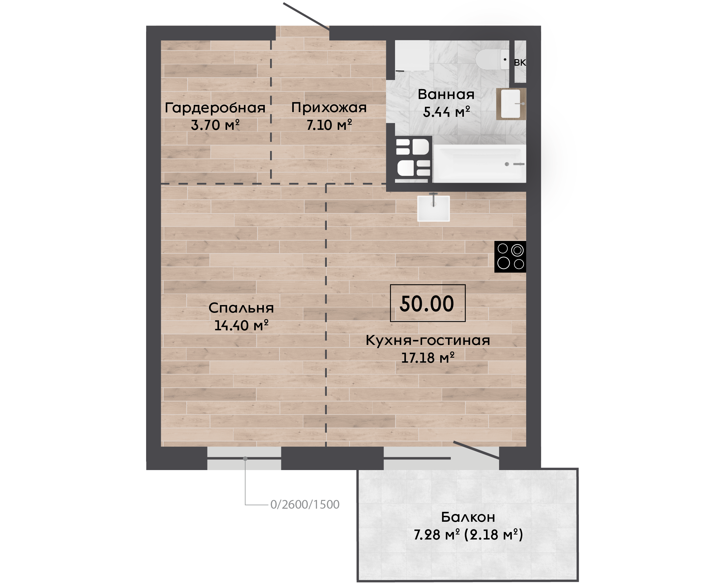 50,00 м² Площадь квартиры 3 м Высота потолков 7,28 м² Площадь балкона