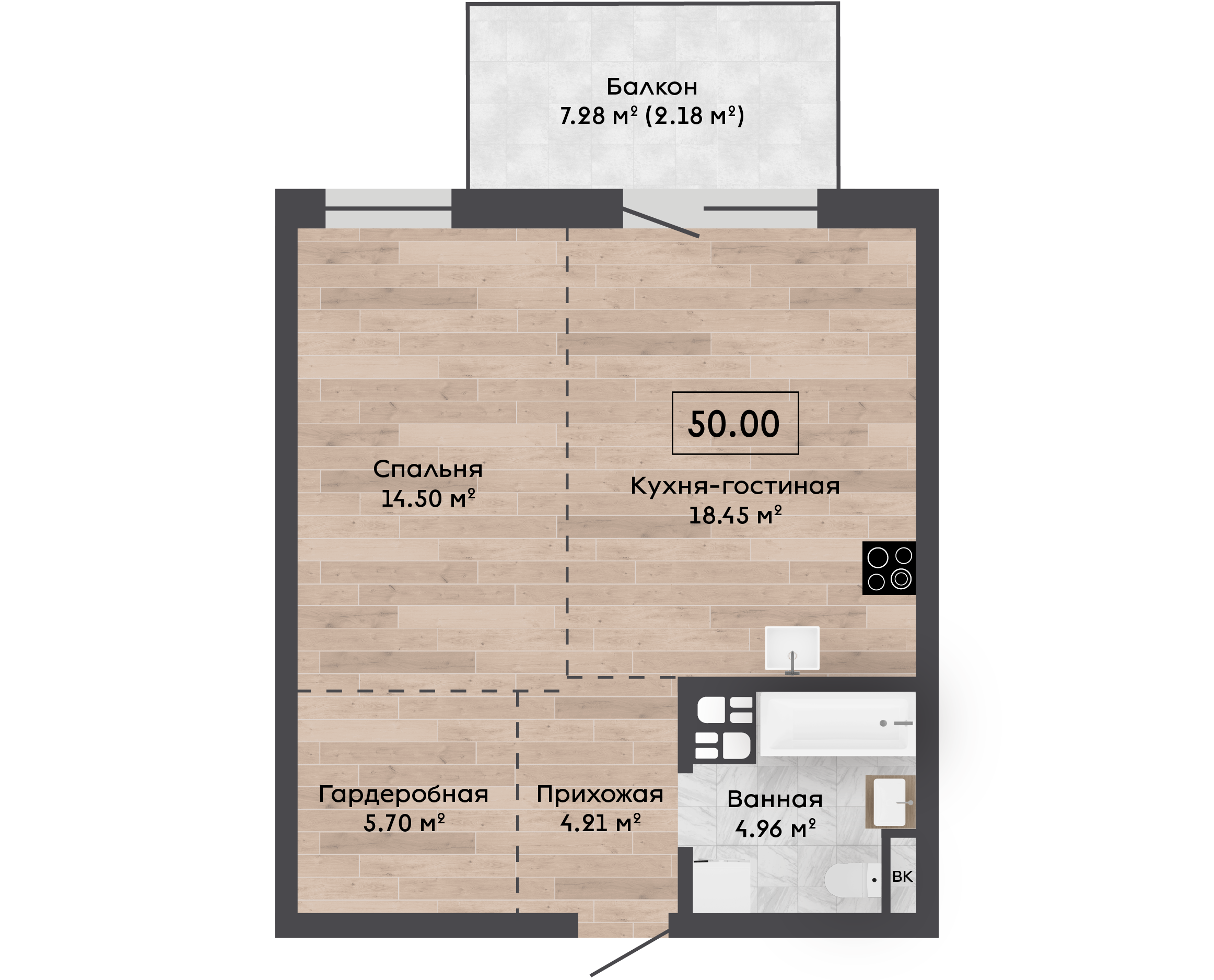 | 50,00 м² Площадь квартиры | 3 м Высота потолков | 7,28 м² Площадь балкона |