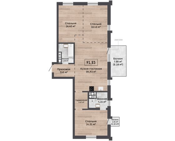 | 91,23 м² Площадь квартиры | 3 м Высота потолков | 7,28 м² Площадь балкона |
