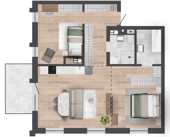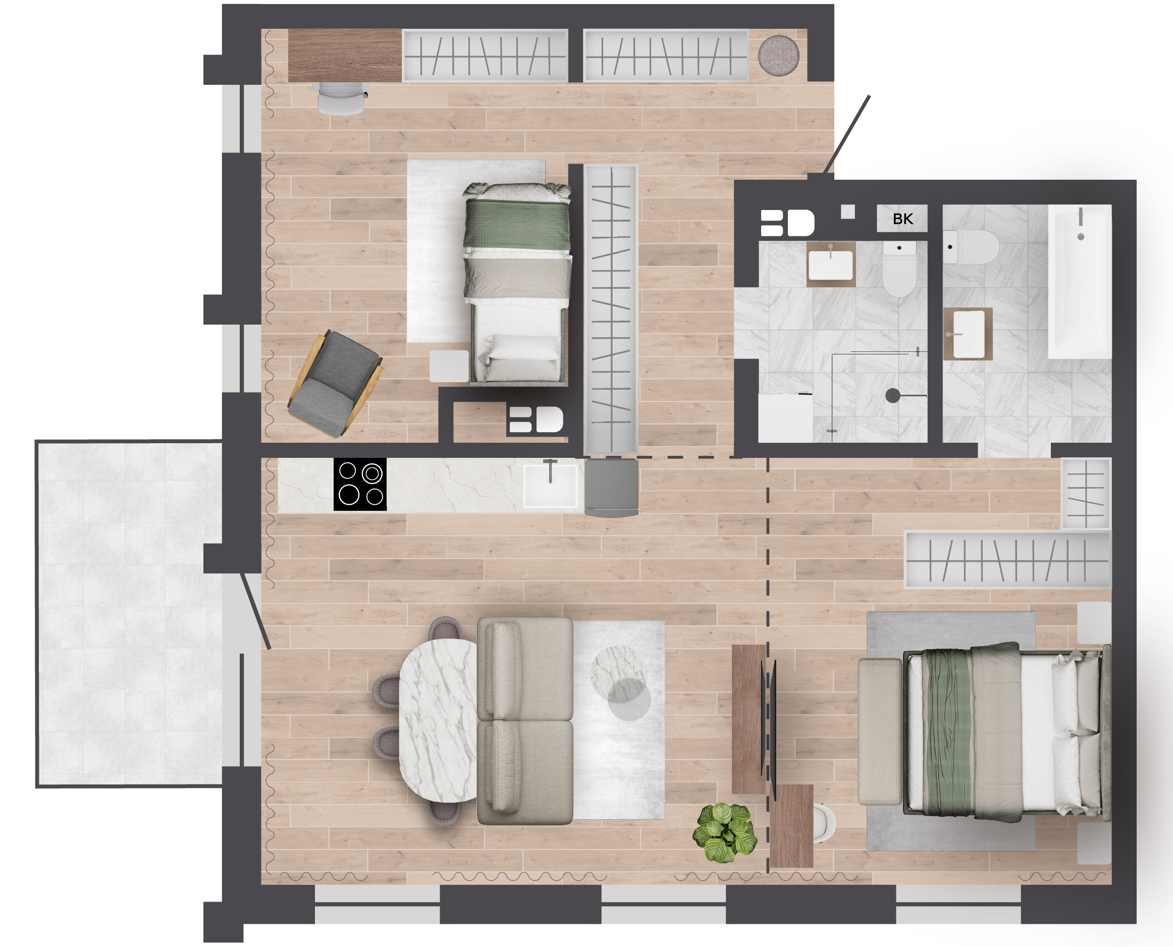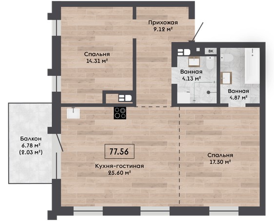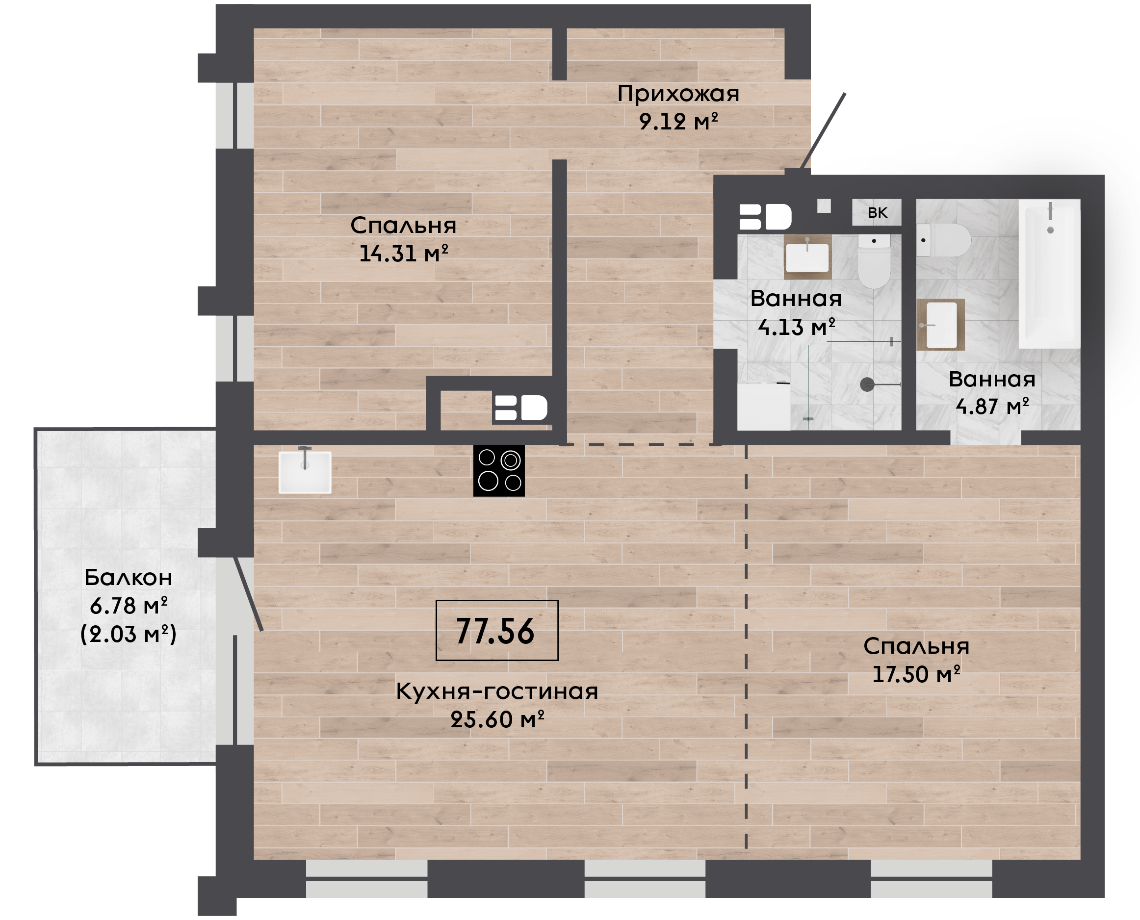 | 77,56 м² Площадь квартиры | 3 м Высота потолка | 6,78 м² Площадь балкона |