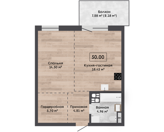 50,00 м² Площадь квартиры 3 м Высота потолков 7,28 м² Площадь балкона