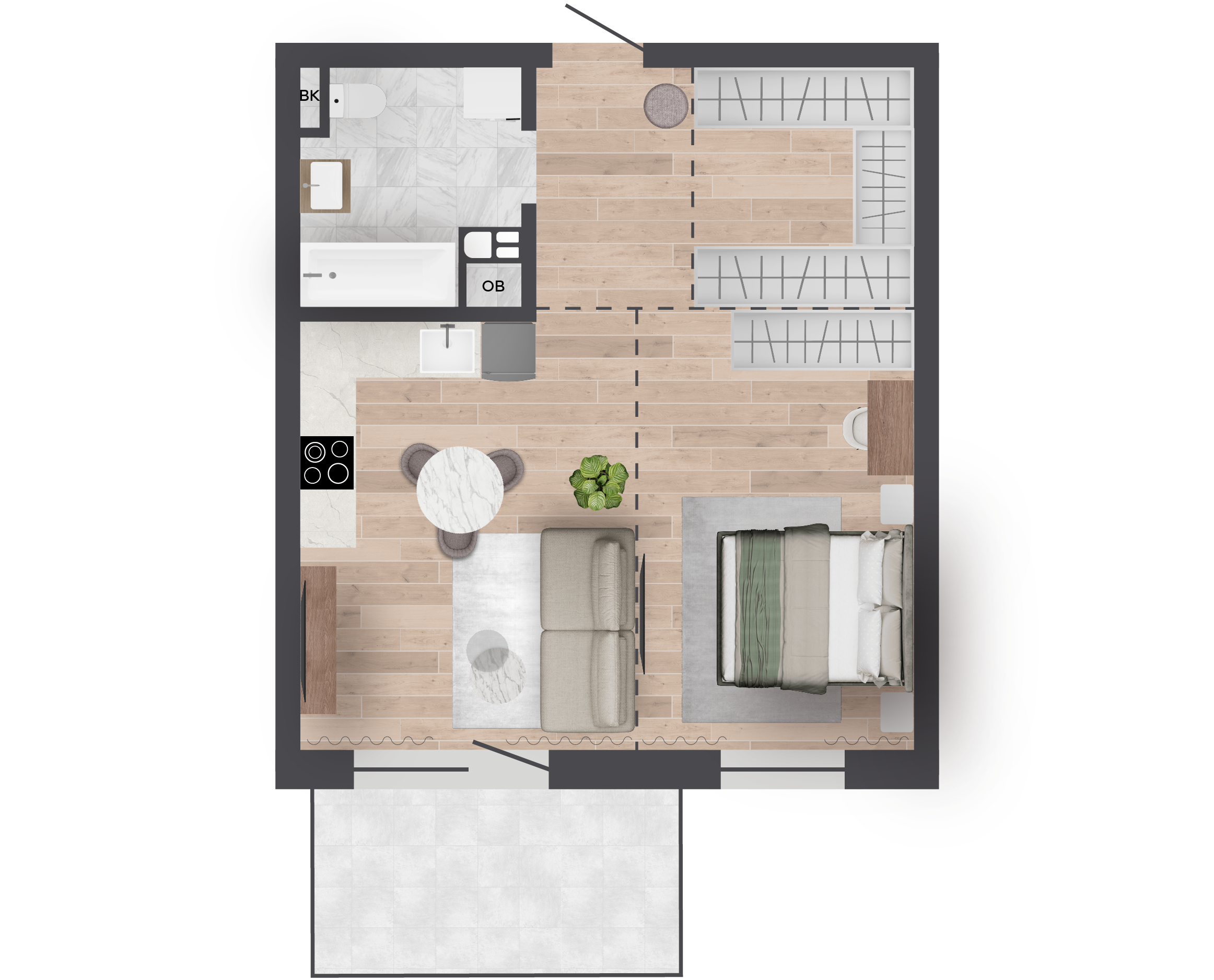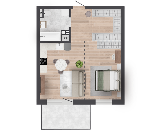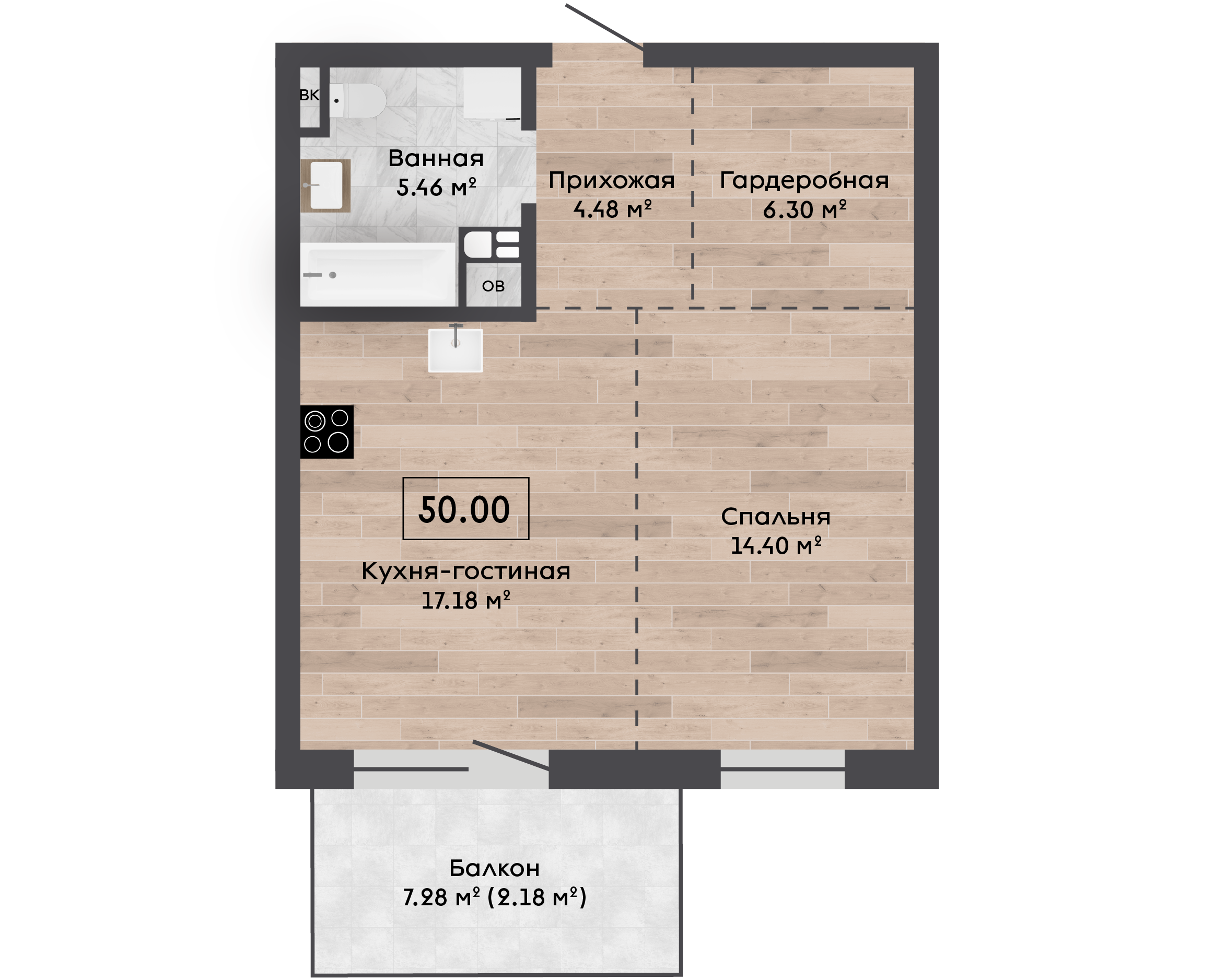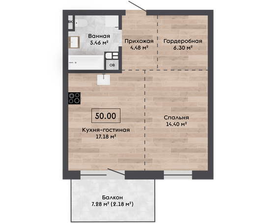 | 50,00 м² Площадь квартиры | 3 м Высота потолков | 7,28 м² Площадь балкона |