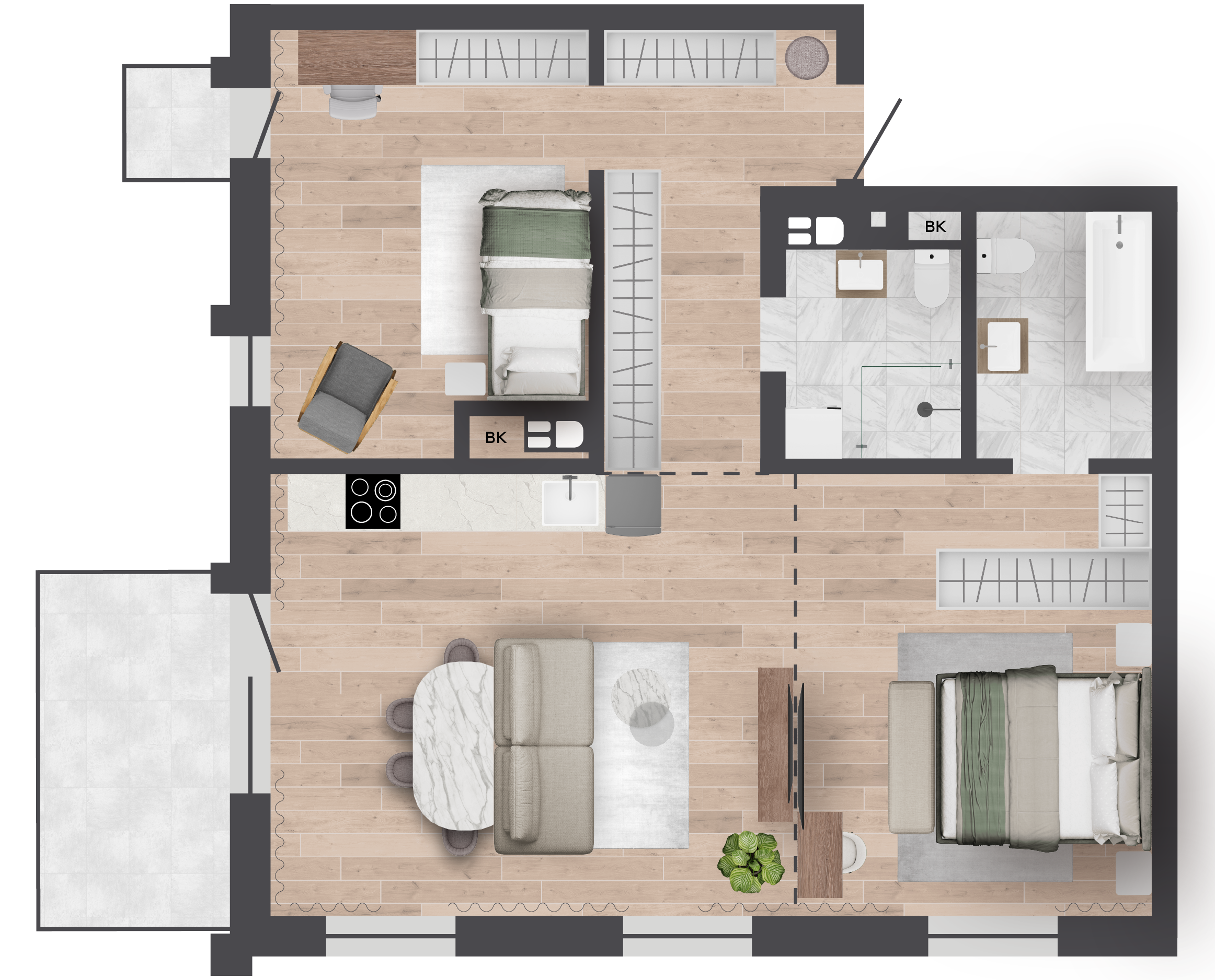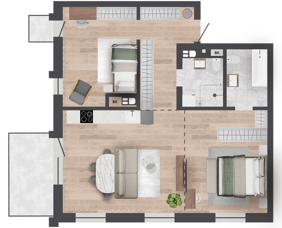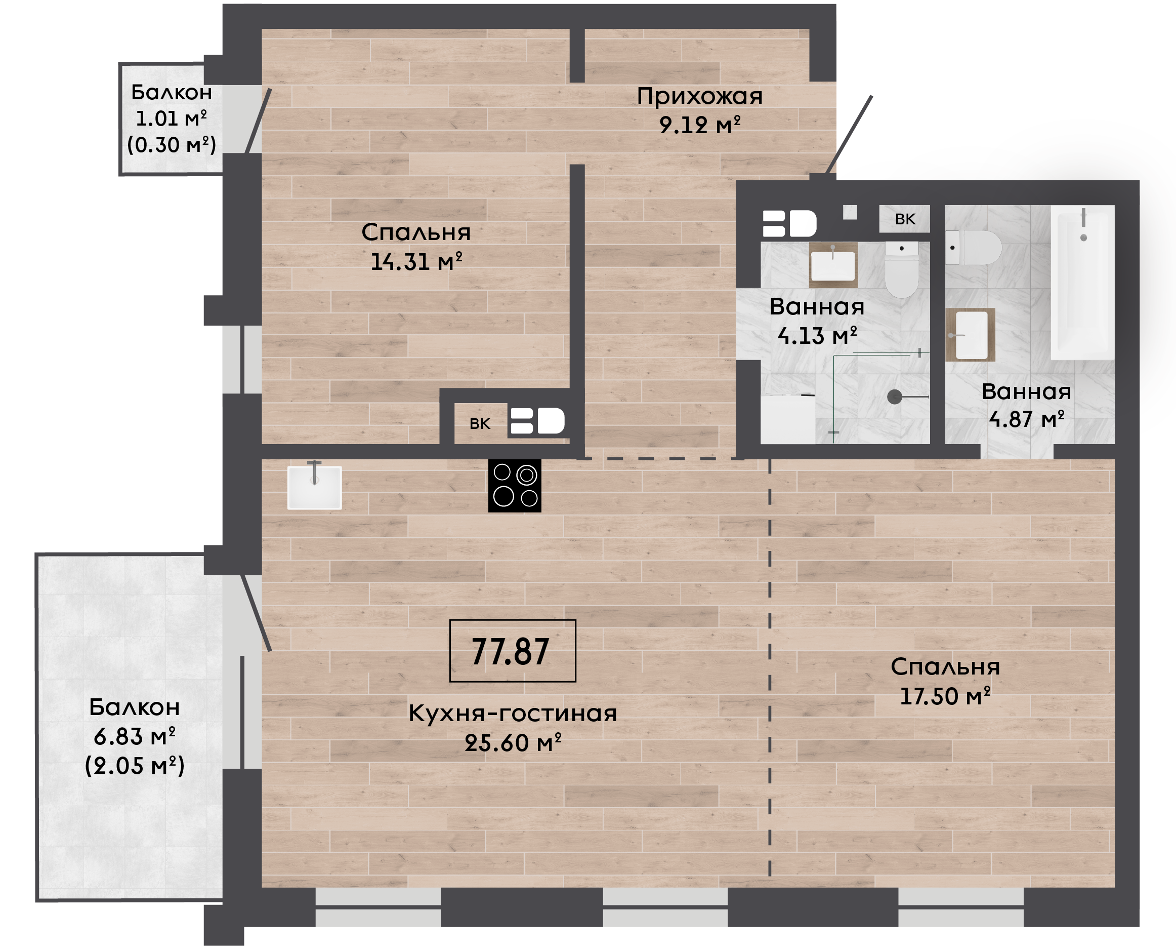 | 77,87 м² Площадь квартиры | 3 м Высота потолков | 6,83 м² Площадь балкона |
