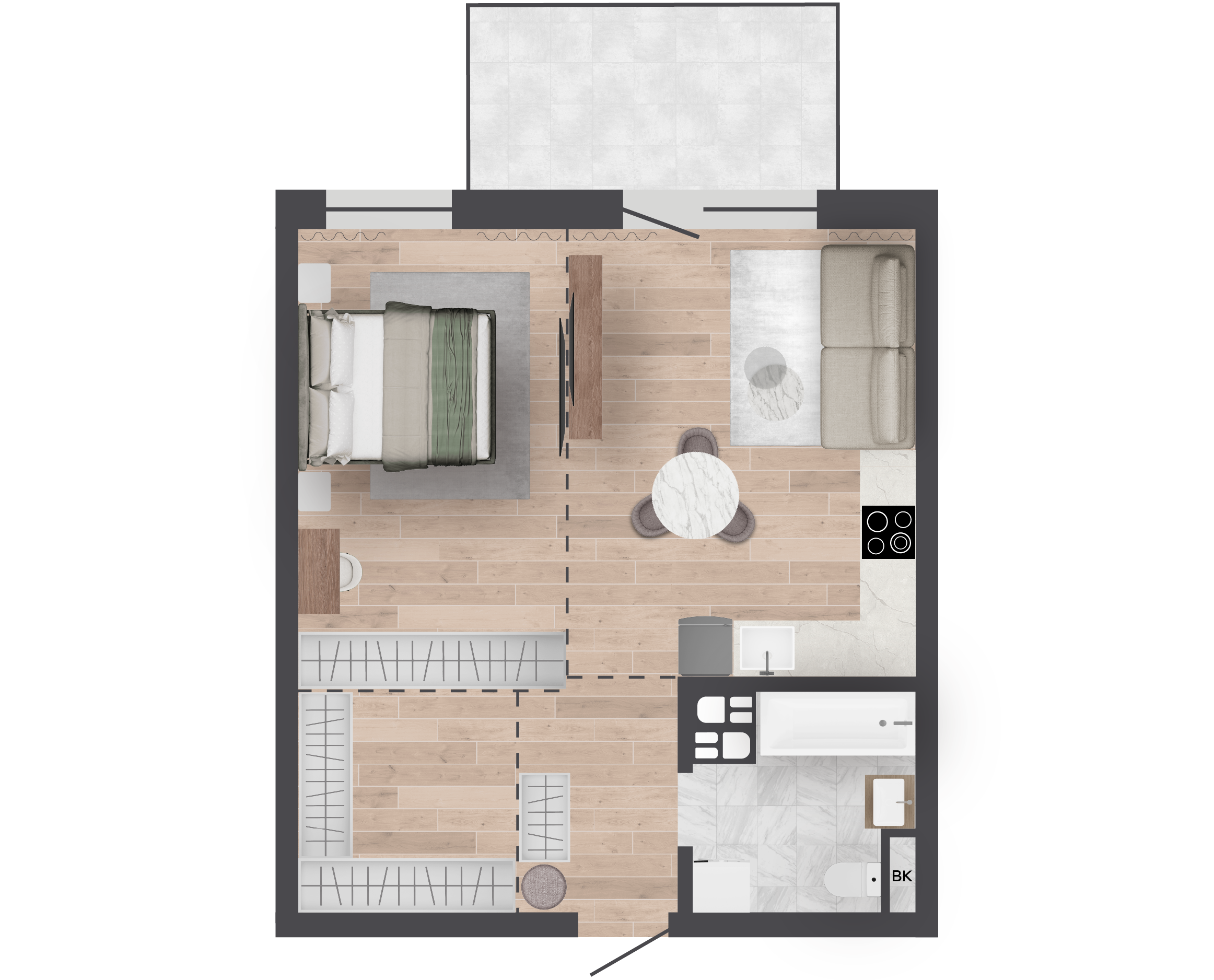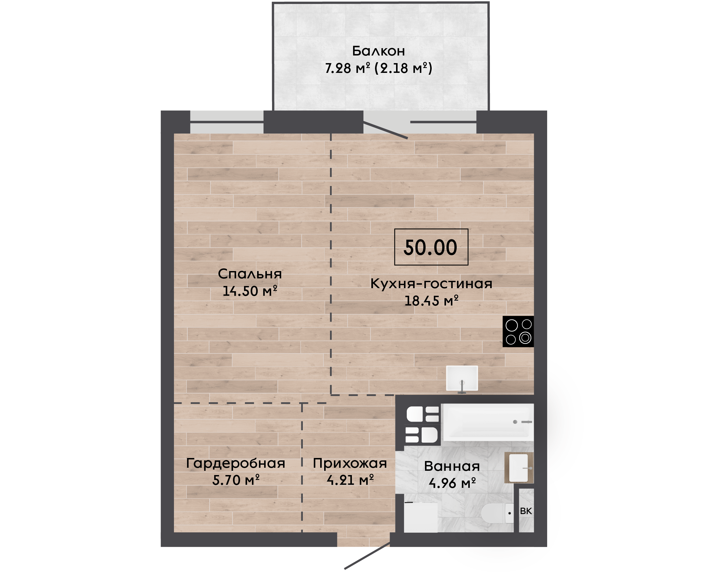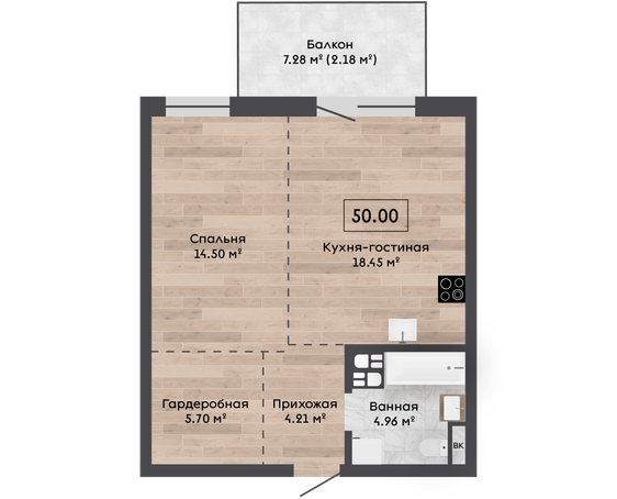 | 50,00 м² Площадь квартиры | 3 м Высота потолков | 7,28 м² Площадь балкона |