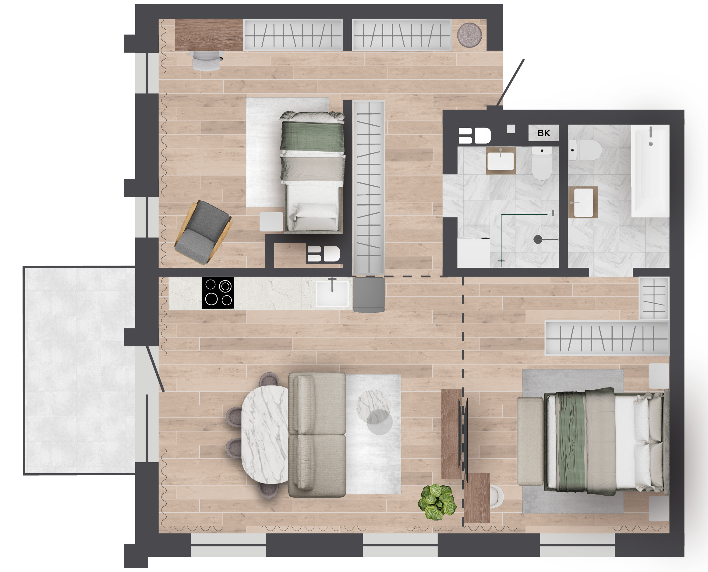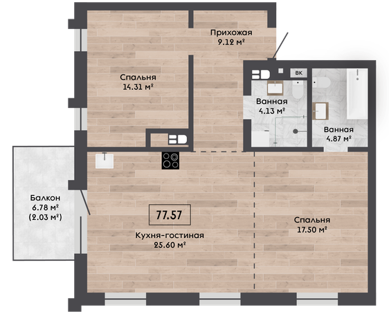 | 77,57 м² Площадь квартиры | 3 м Высота потолков | 6,78 м² Площадь балкона |
