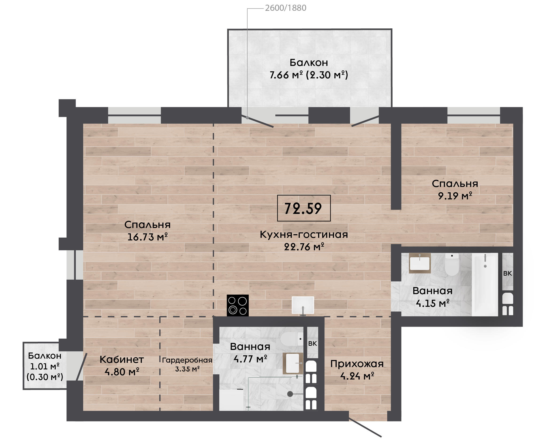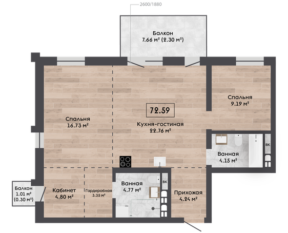 | 72,59 м² Площадь квартиры | 3 м Высота потолков | 7,66 м² Площадь балкона |