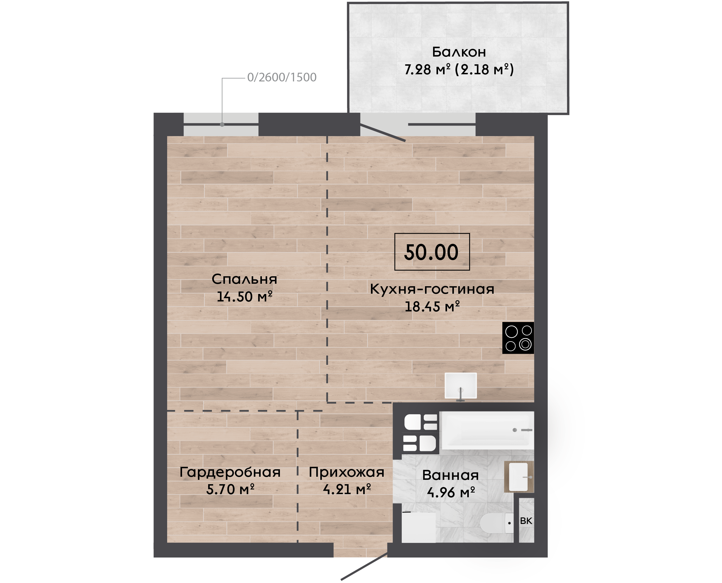 50,00 м² Площадь квартиры 3 м Высота потолков 7,28 м² Площадь балкона