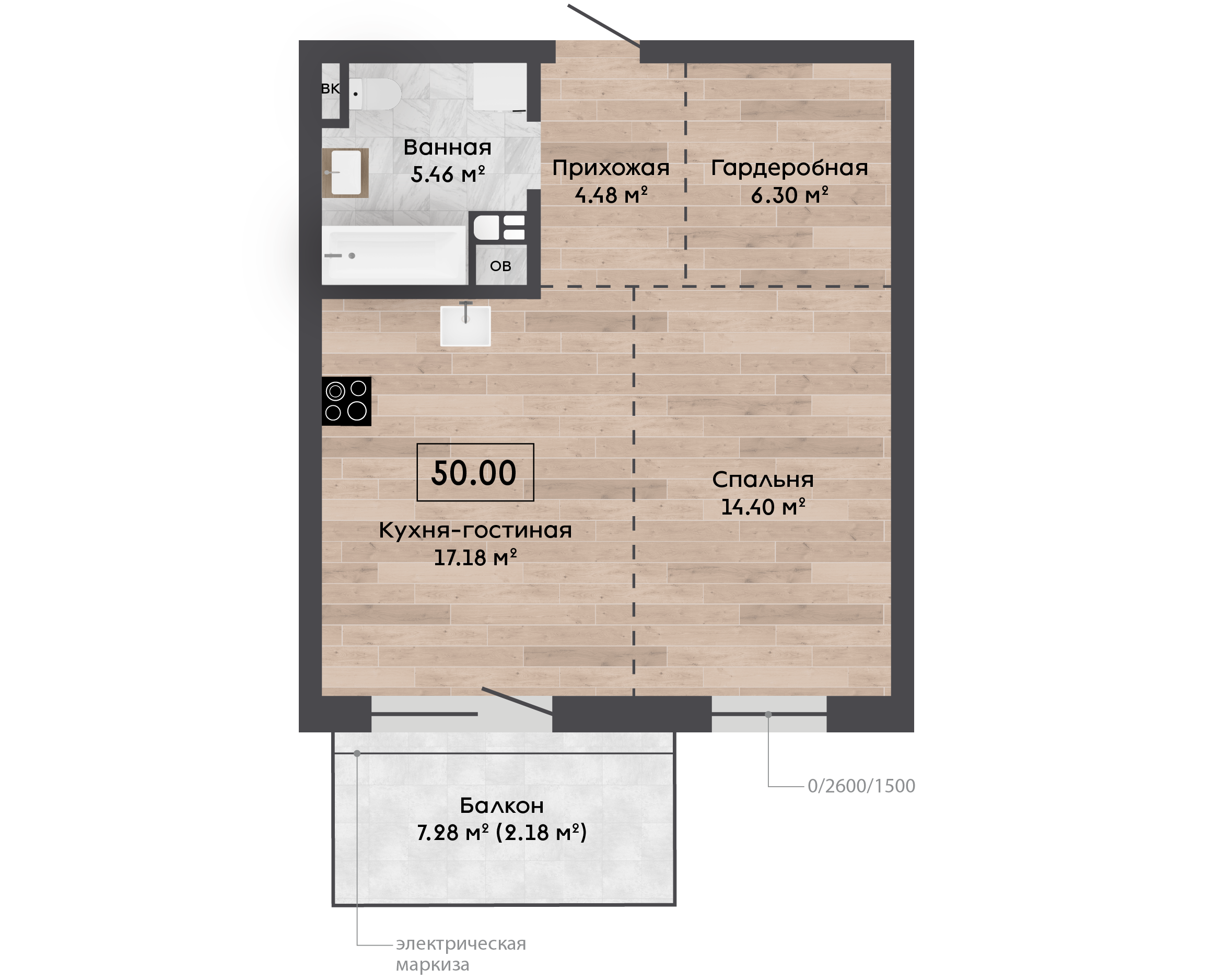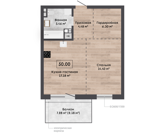 50,00 м² Площадь квартиры 3 м Высота потолков 7,28 м² Площадь балкона