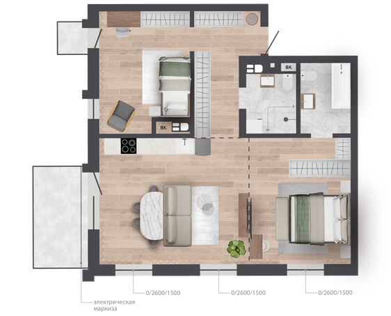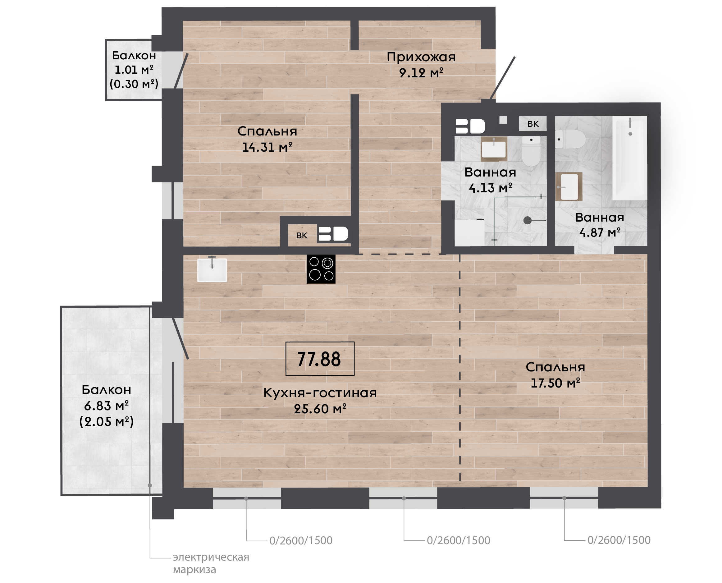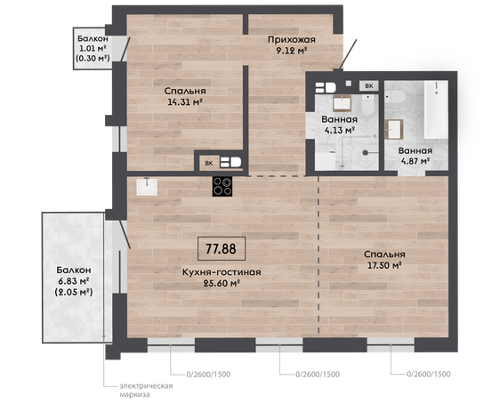 | 77,88 м² Площадь квартиры | 3 м Высота потолков | 6,83 м² Площадь балкона |