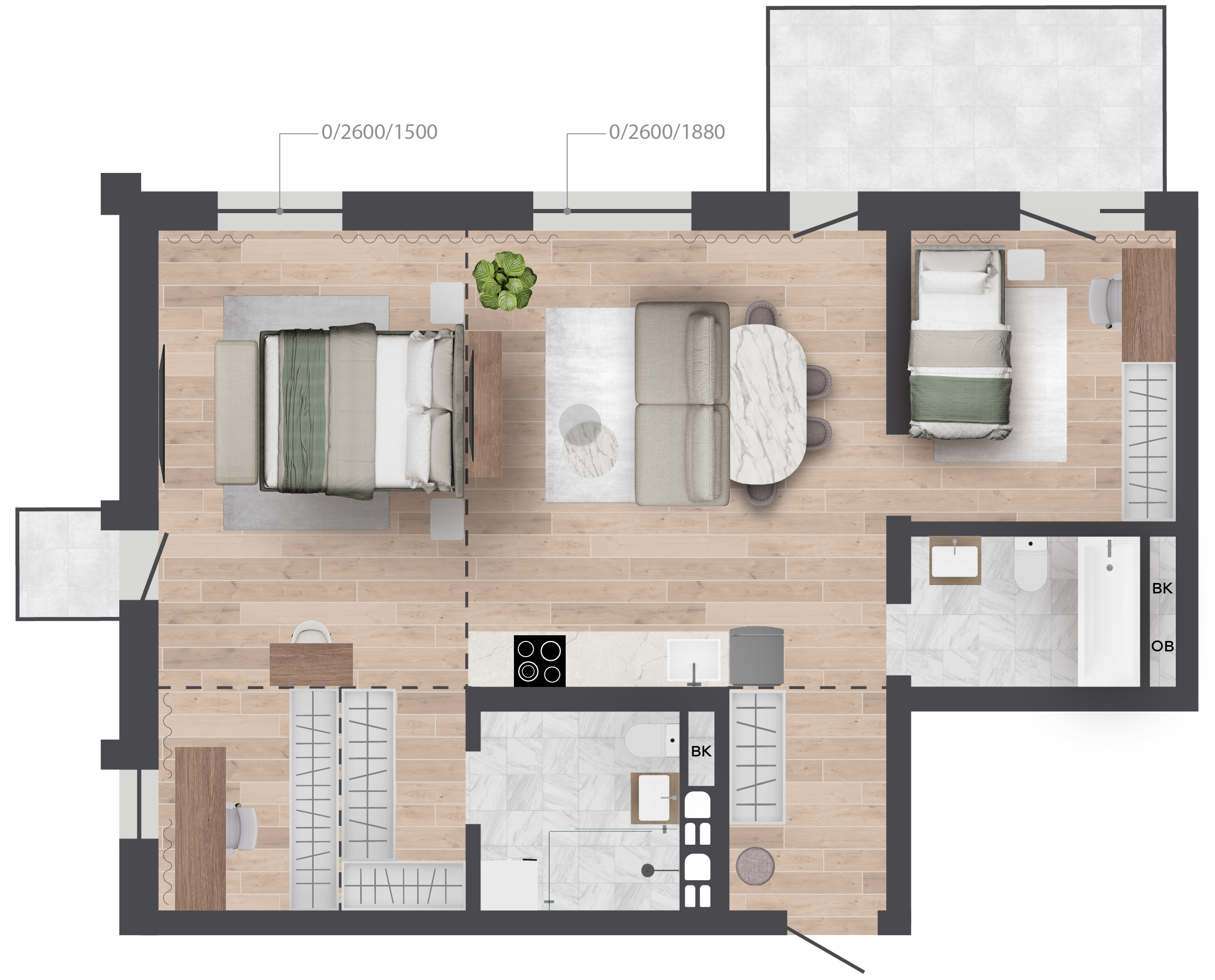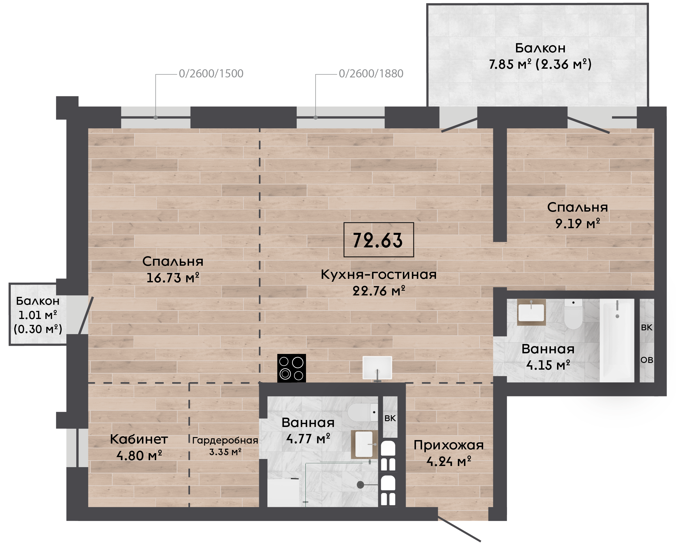 | 72,63 м² Площадь квартиры | 3 м Высота потолков | 7,85 м² Площадь балкона |