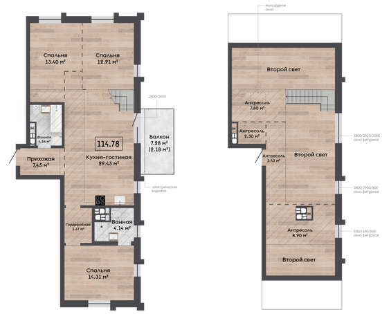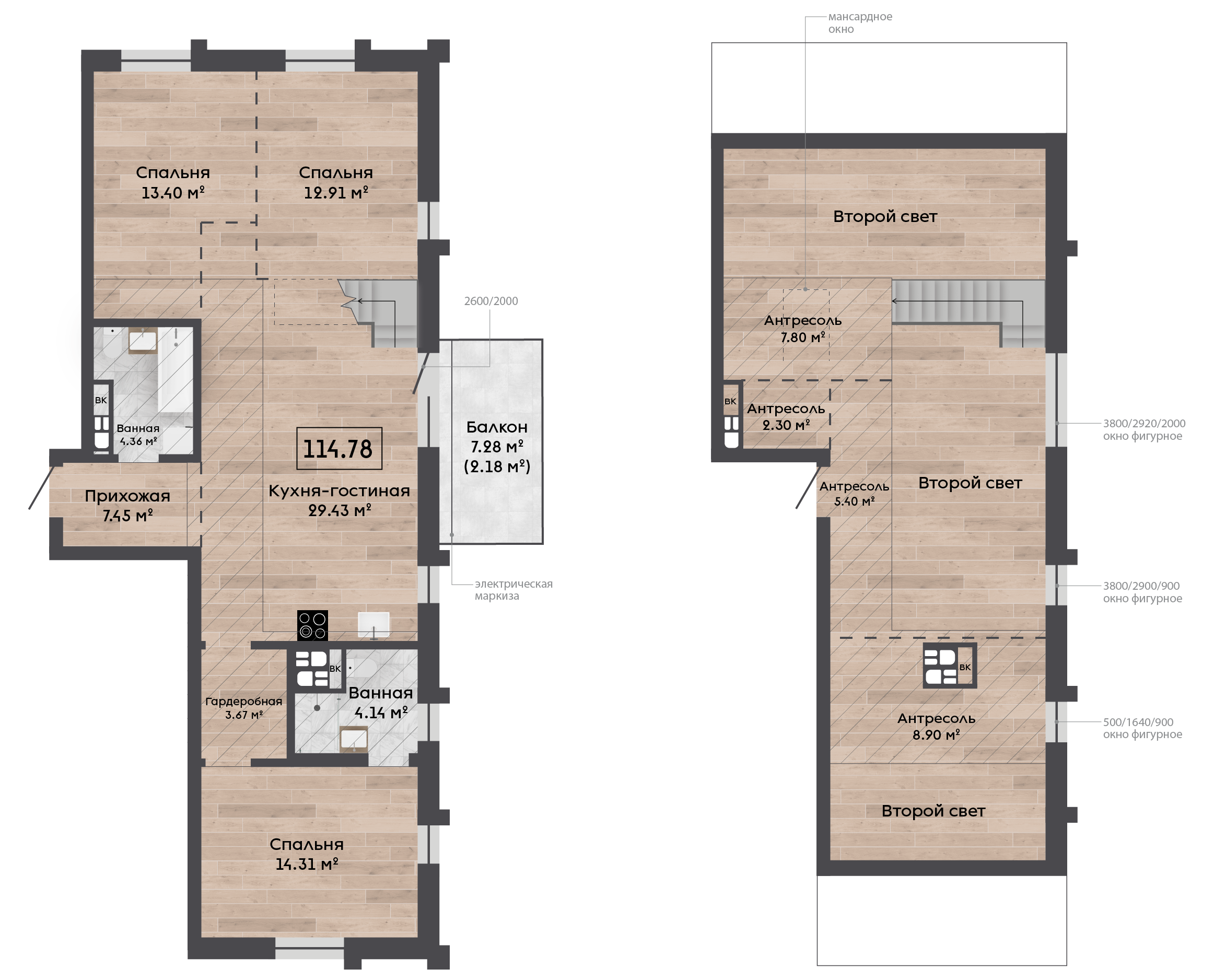 | 114,78 м² Площадь квартиры | от 3 м Высота потолков | 7,28 м² Площадь балкона |