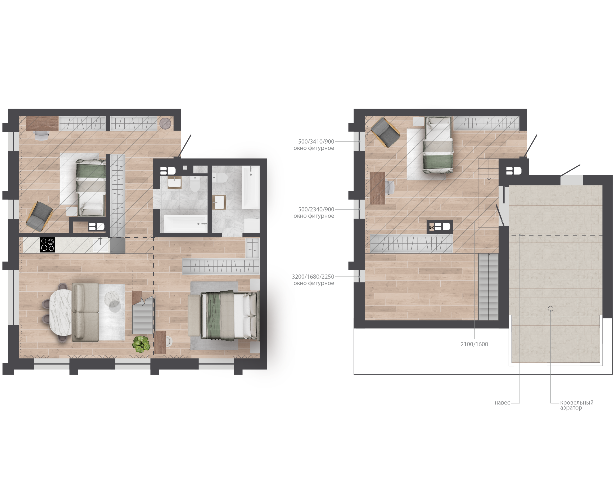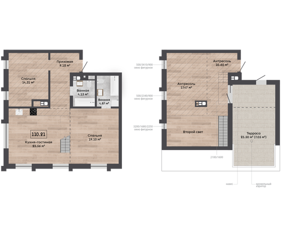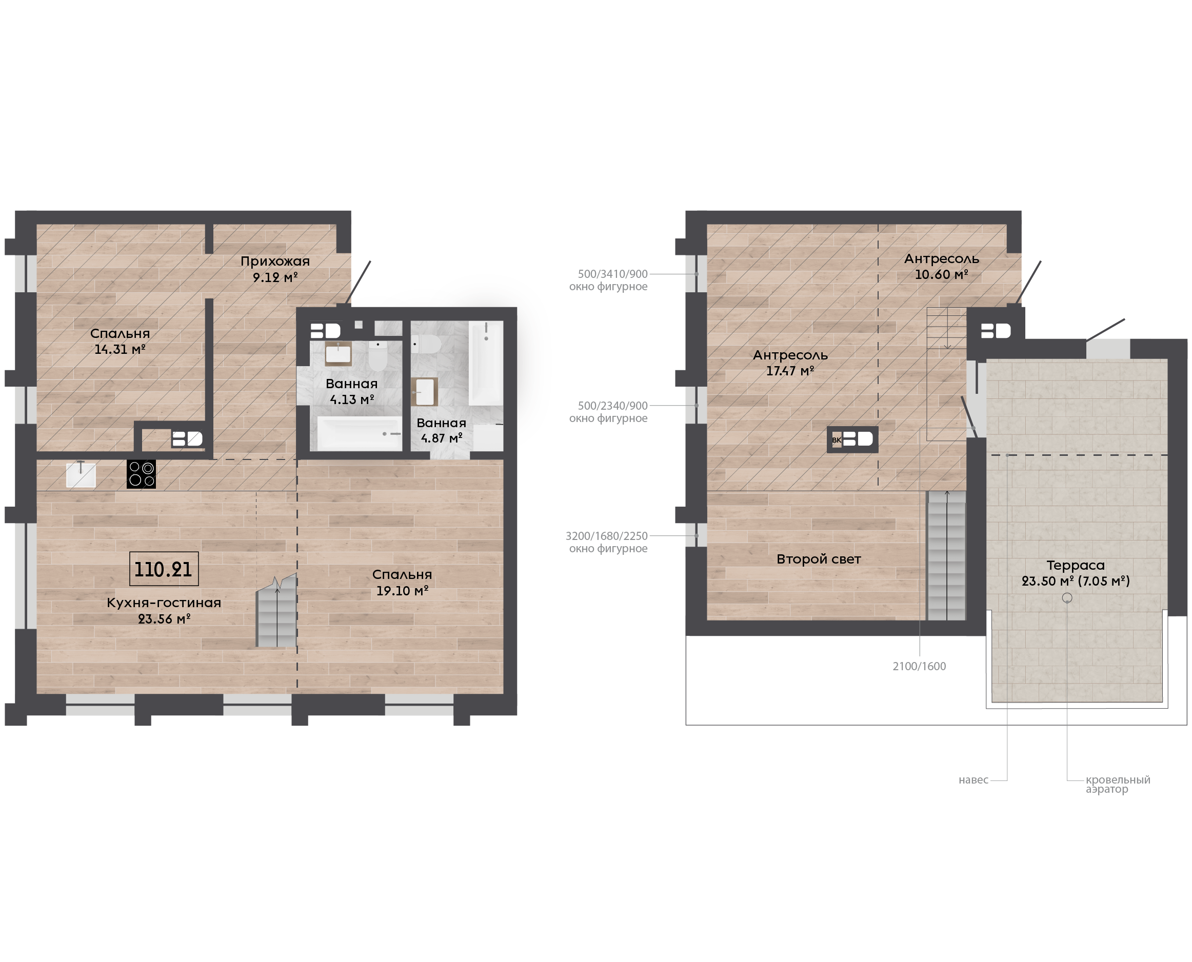 | 110,21 м² Площадь квартиры | от 3 м Высота потолков | 23 м² Площадь террасы |