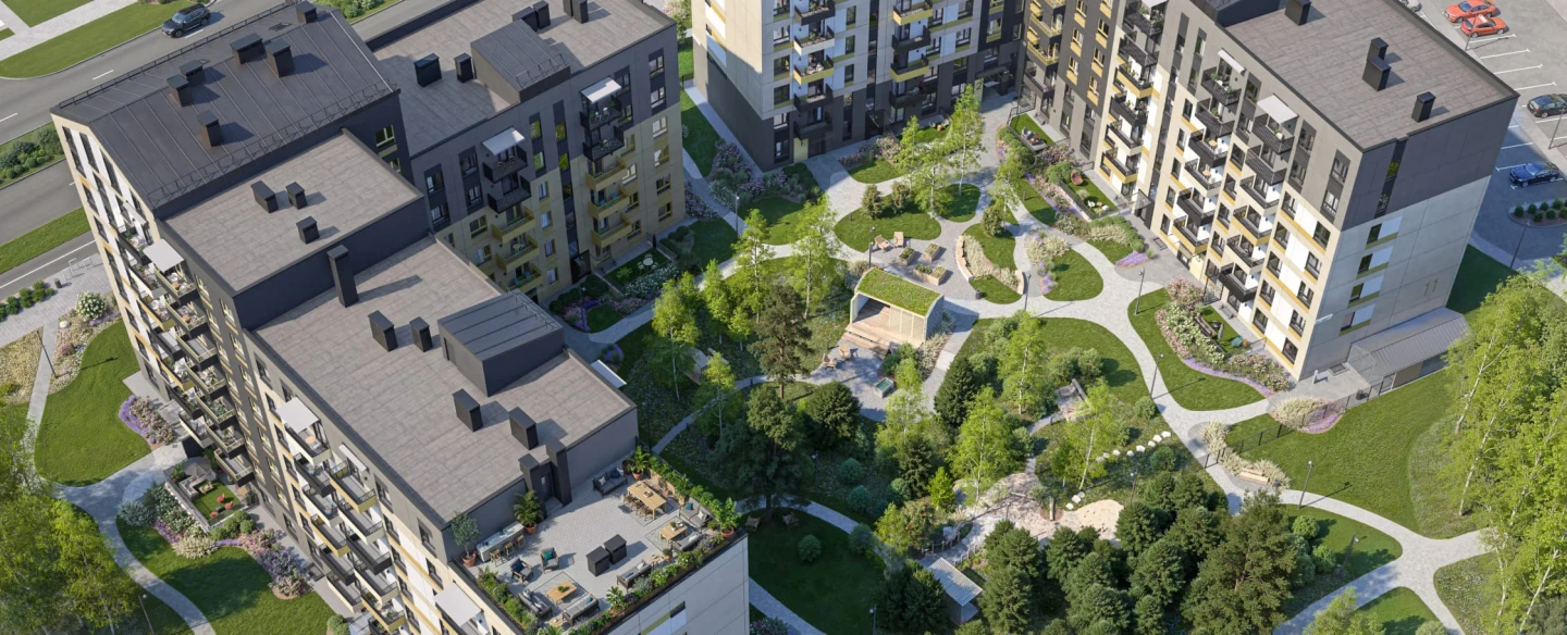 Внутреннее благоустройство двора будет создано из сохраненных лесных деревьев, к которым в дополнение будут высажены кустарники и многолетние травы. И будет включать: