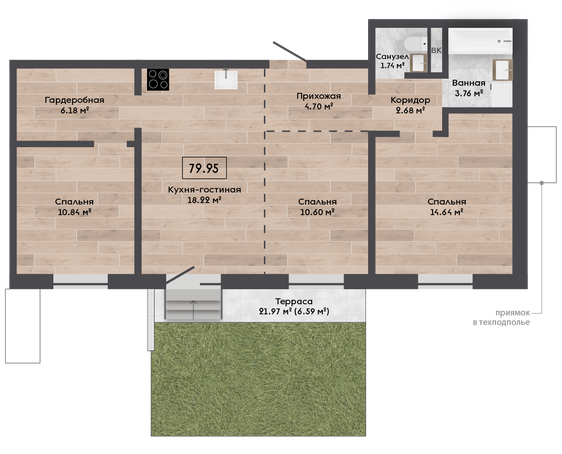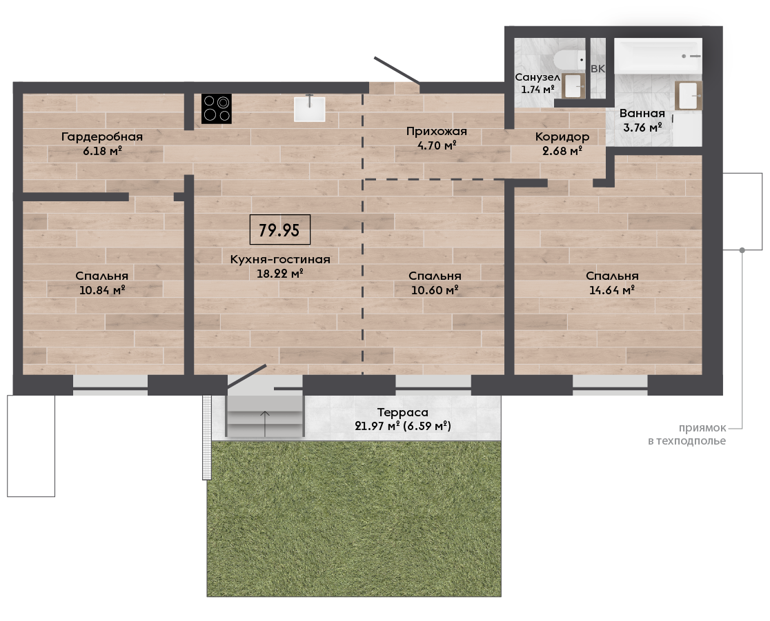 | 79,95 м² Площадь квартиры | 2,7 м Высота потолков | 21,97 м² Площадь участка |