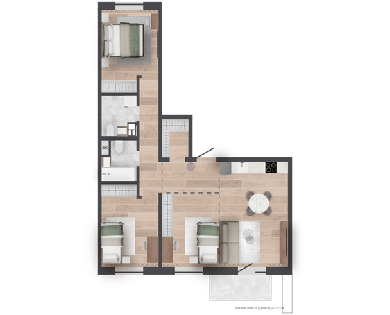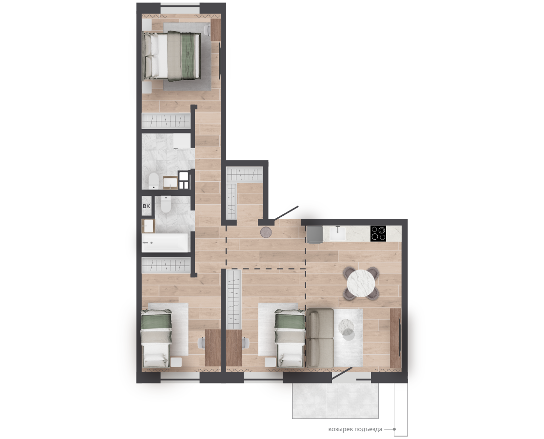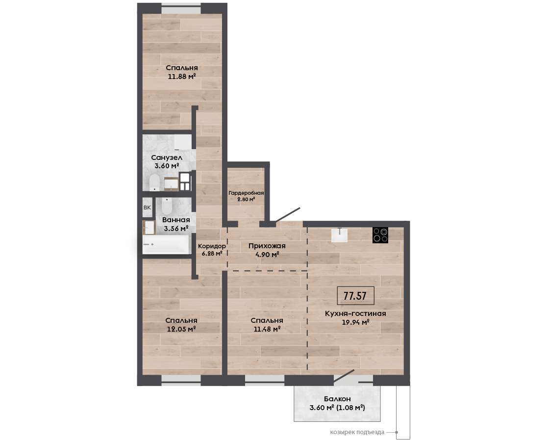 | 77,57 м² Площадь квартиры | 2,7 м Высота потолков | 500 мм Высота подоконной части |