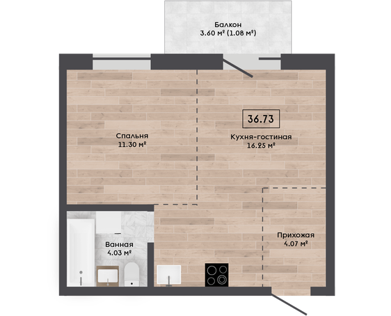 | 36,73 м² Площадь квартиры | 2,7 м Высота потолков | 500 мм Высота подоконной части |