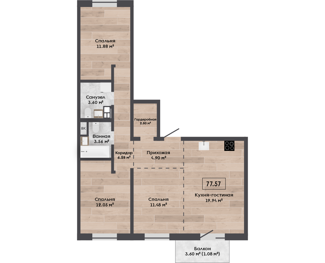 Обязательная покупка при приобретении квартиры| Площадь, м.кв. | 77.57 |