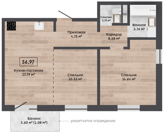 Обязательная покупка при приобретении квартиры| Площадь, м.кв. | 56.97 |