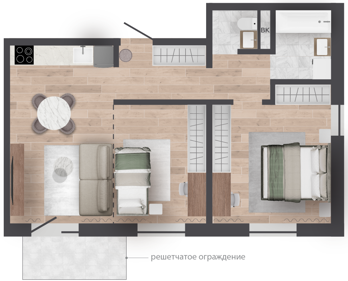 | 56,97 м² Площадь квартиры | 2,7 м Высота потолков | 500 мм Высота подоконной части |