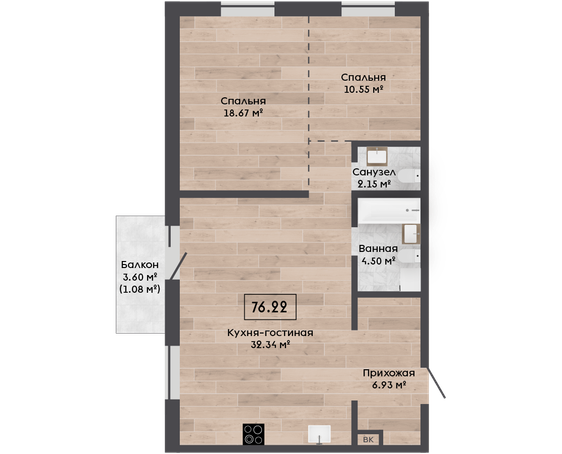 | 76,22 м² Площадь квартиры | 2,7 м Высота потолков | 500 мм Высота подоконной части |