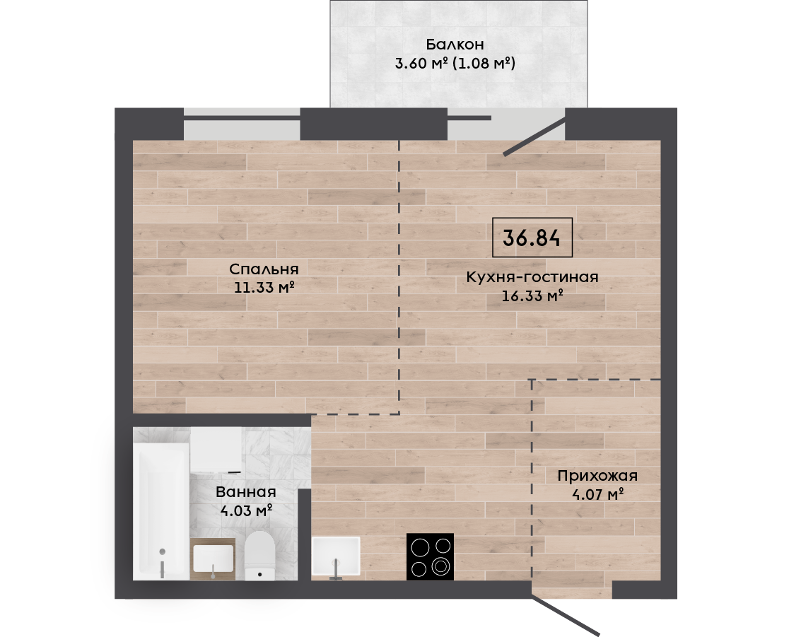 | 36,84 м² Площадь квартиры | 2,7 м Высота потолков | 500 мм Высота подоконной части |