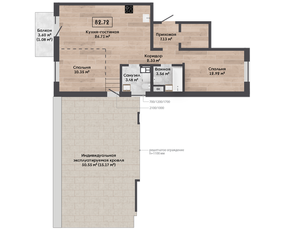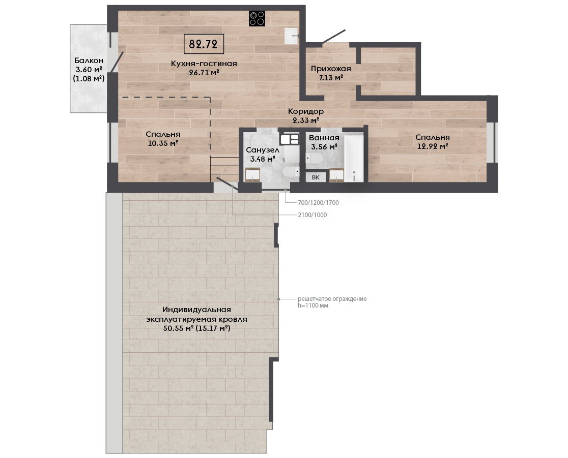 | 82,72 м² Площадь квартиры | 2,7 м Высота потолков | 50,55 м² Площадь террасы |