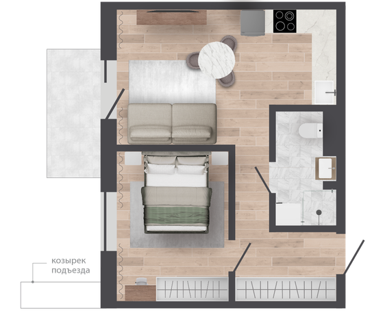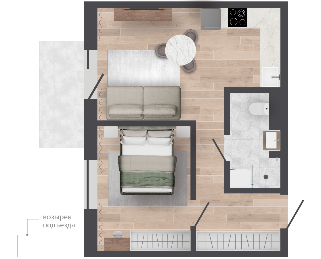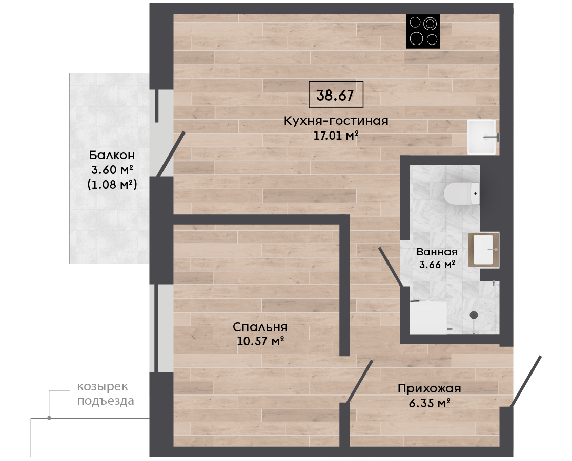| 38,67 м² Площадь квартиры | 2,62 м Высота потолков | 500 мм Высота подоконной части |