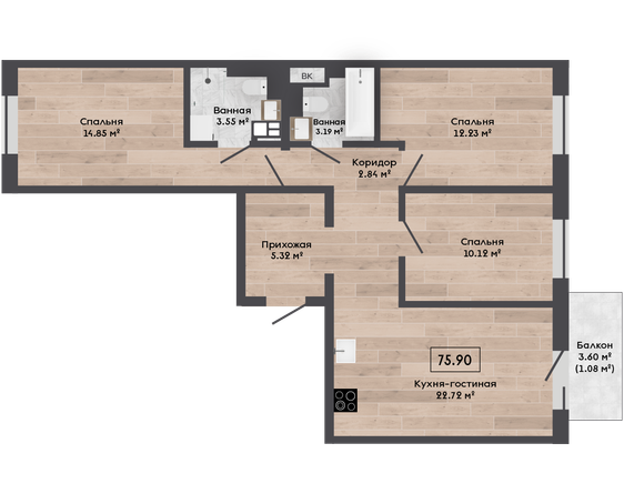 | 75,90 м² Площадь квартиры | 2,7 м Высота потолков | 500 мм Высота подоконной части |