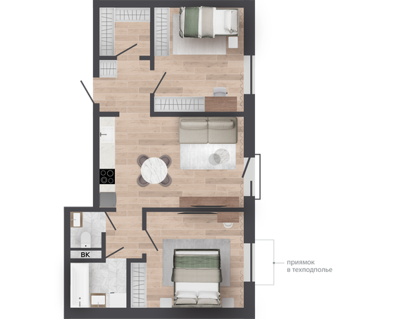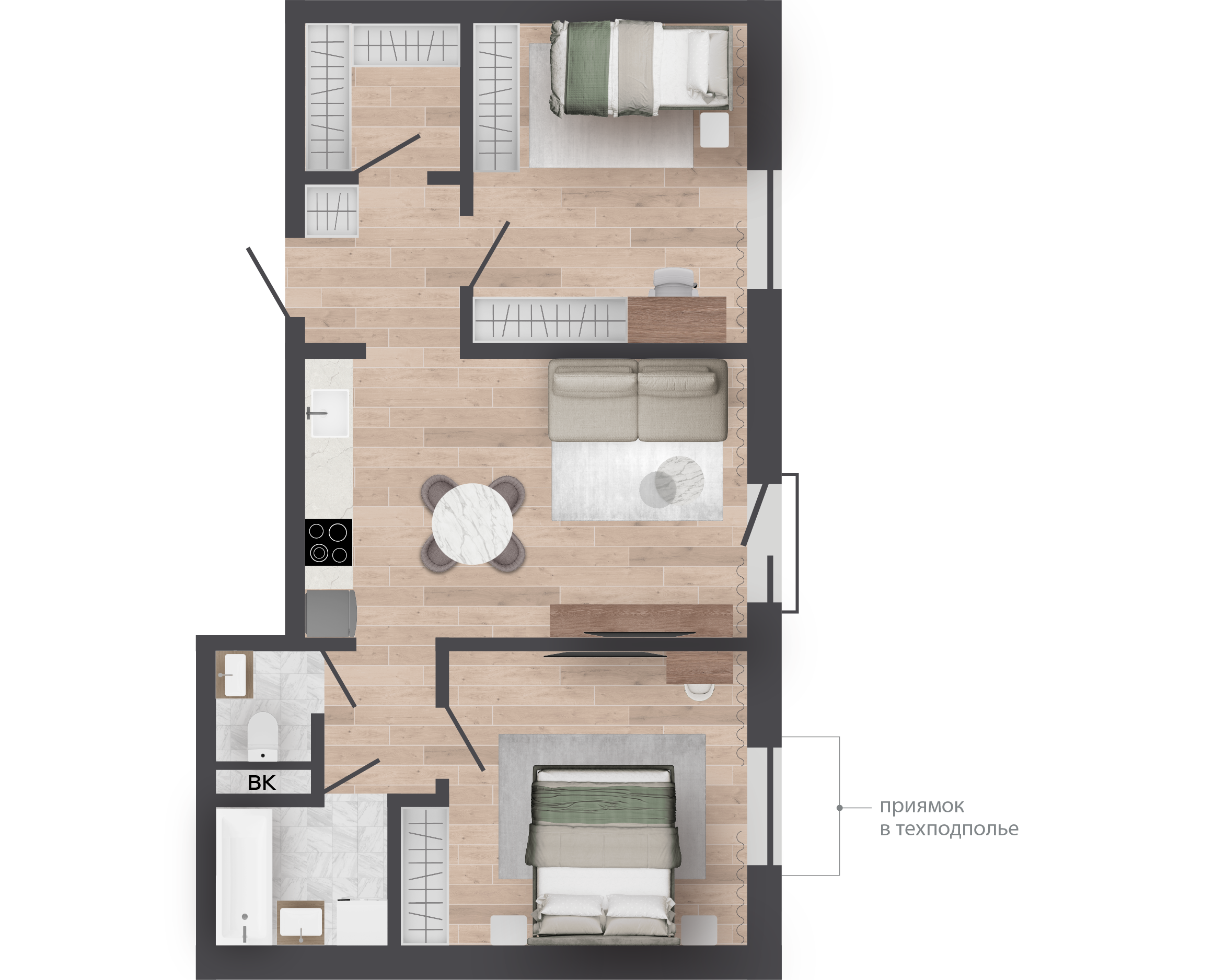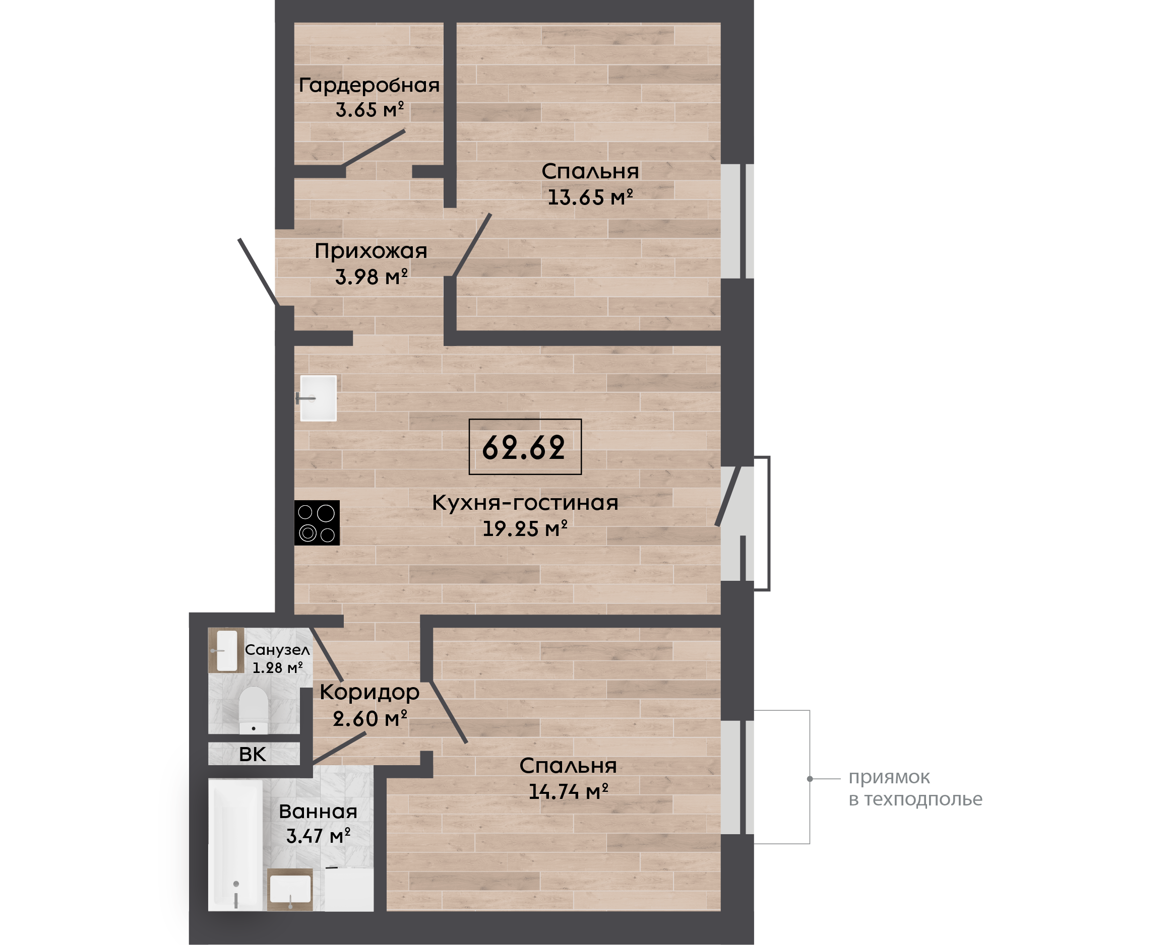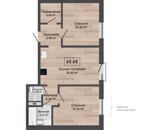 | 62,62 м² Площадь квартиры | 2,62 м Высота потолков | 470 м² Высота подоконной части |