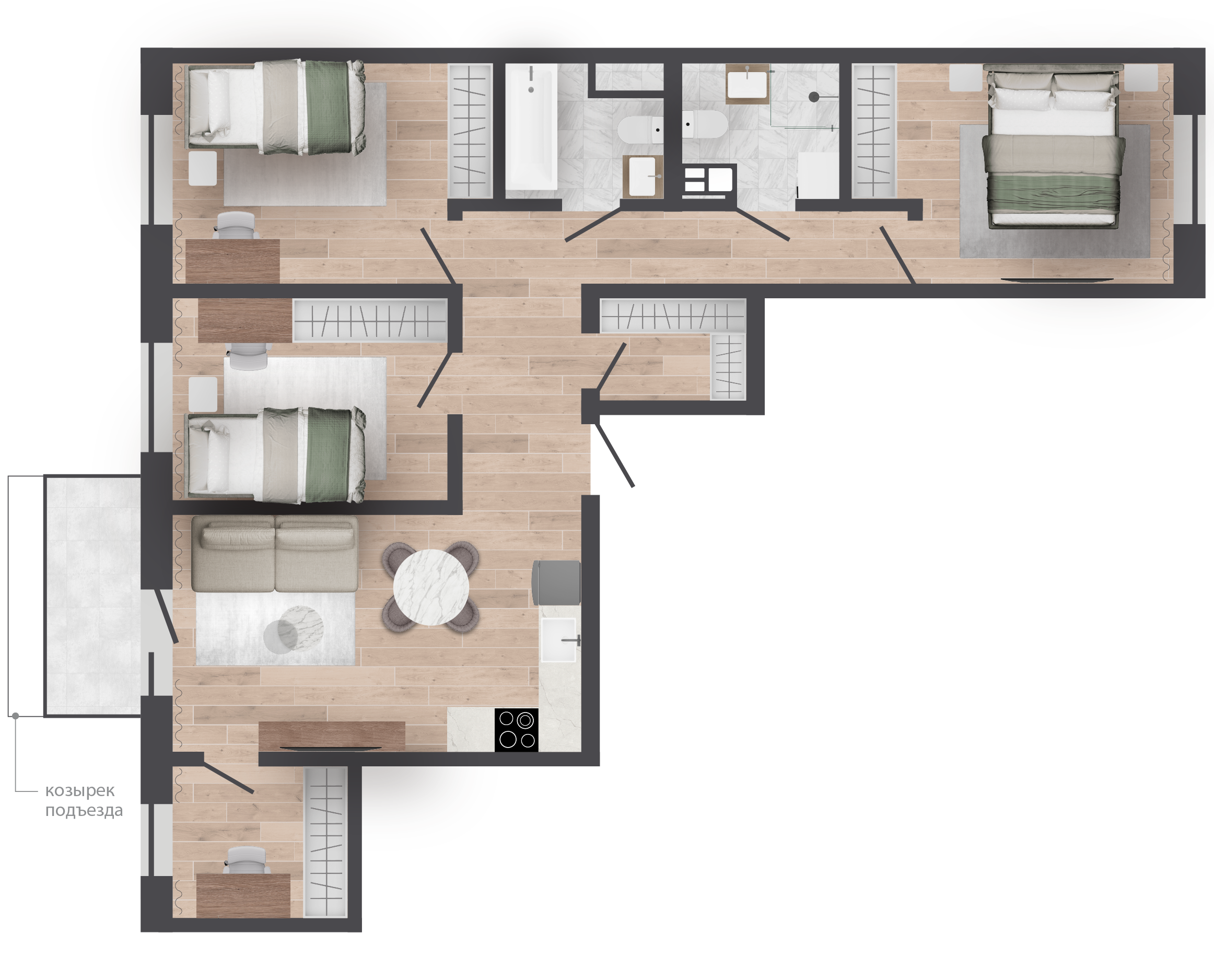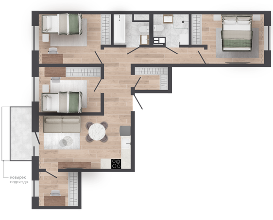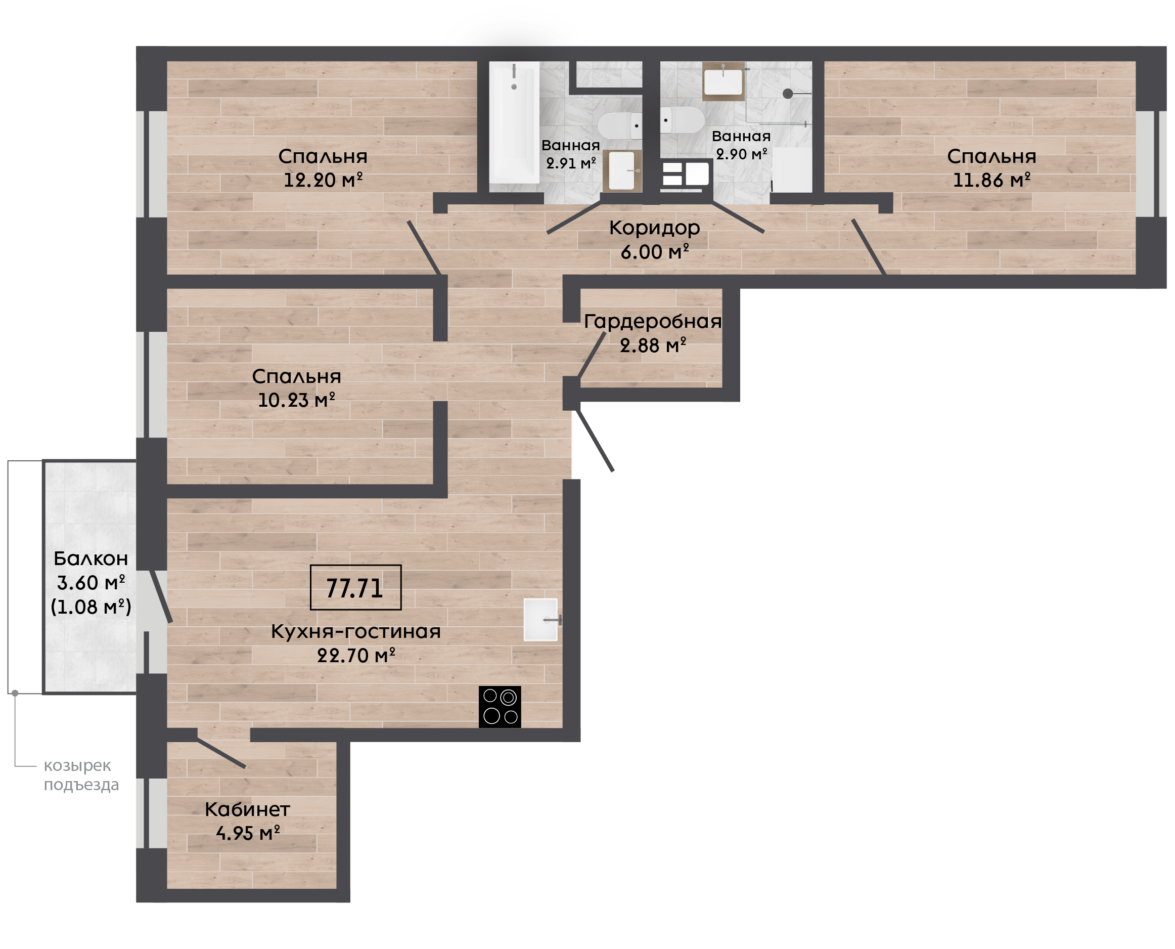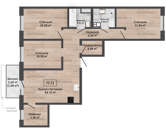 | 77,71 м² Площадь квартиры | 2,62 м Высота потолков | 500 мм Высота подоконной части |