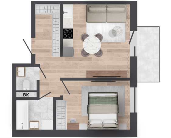 | 42,09 м² Площадь квартиры | 2,62 м Высота потолков | 500 мм Высота подоконной части |