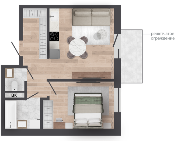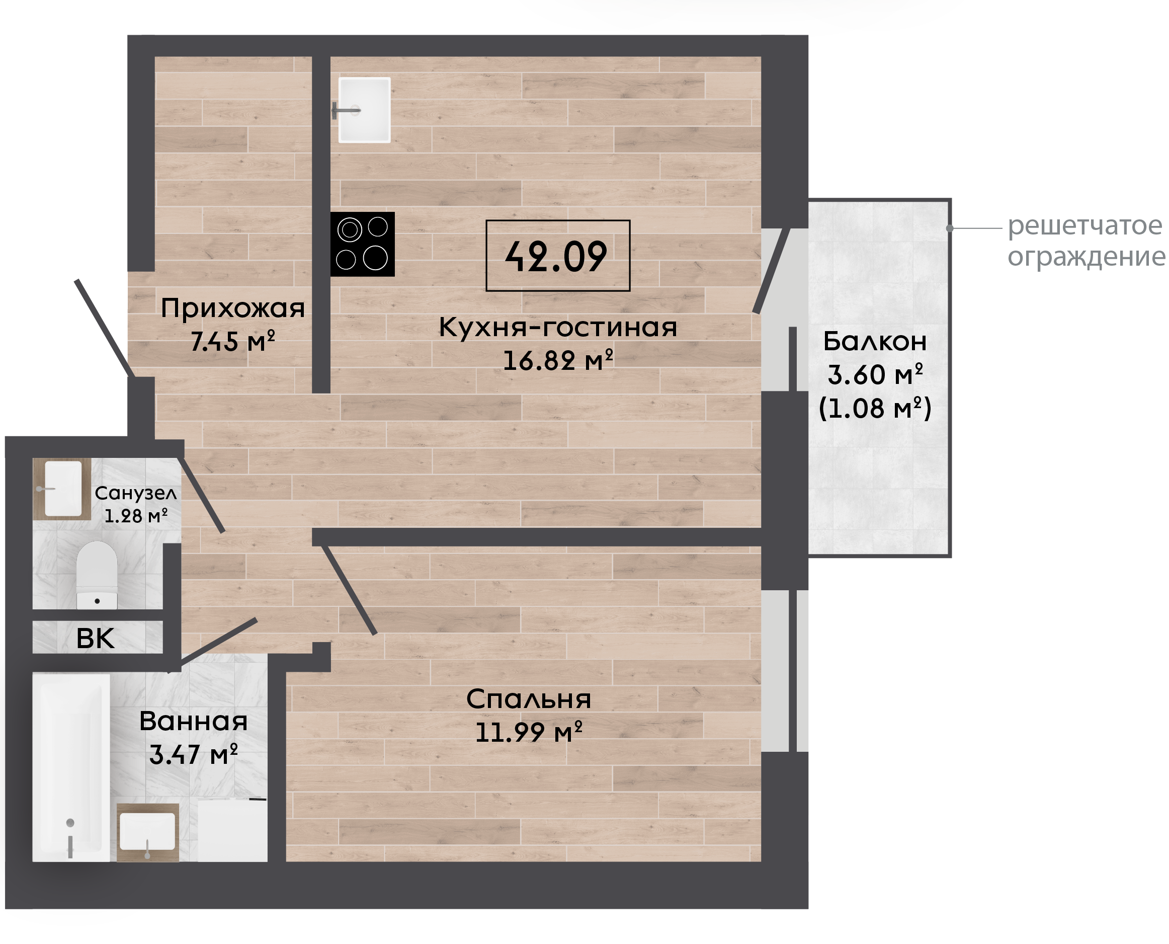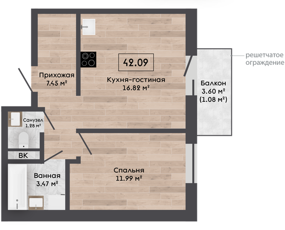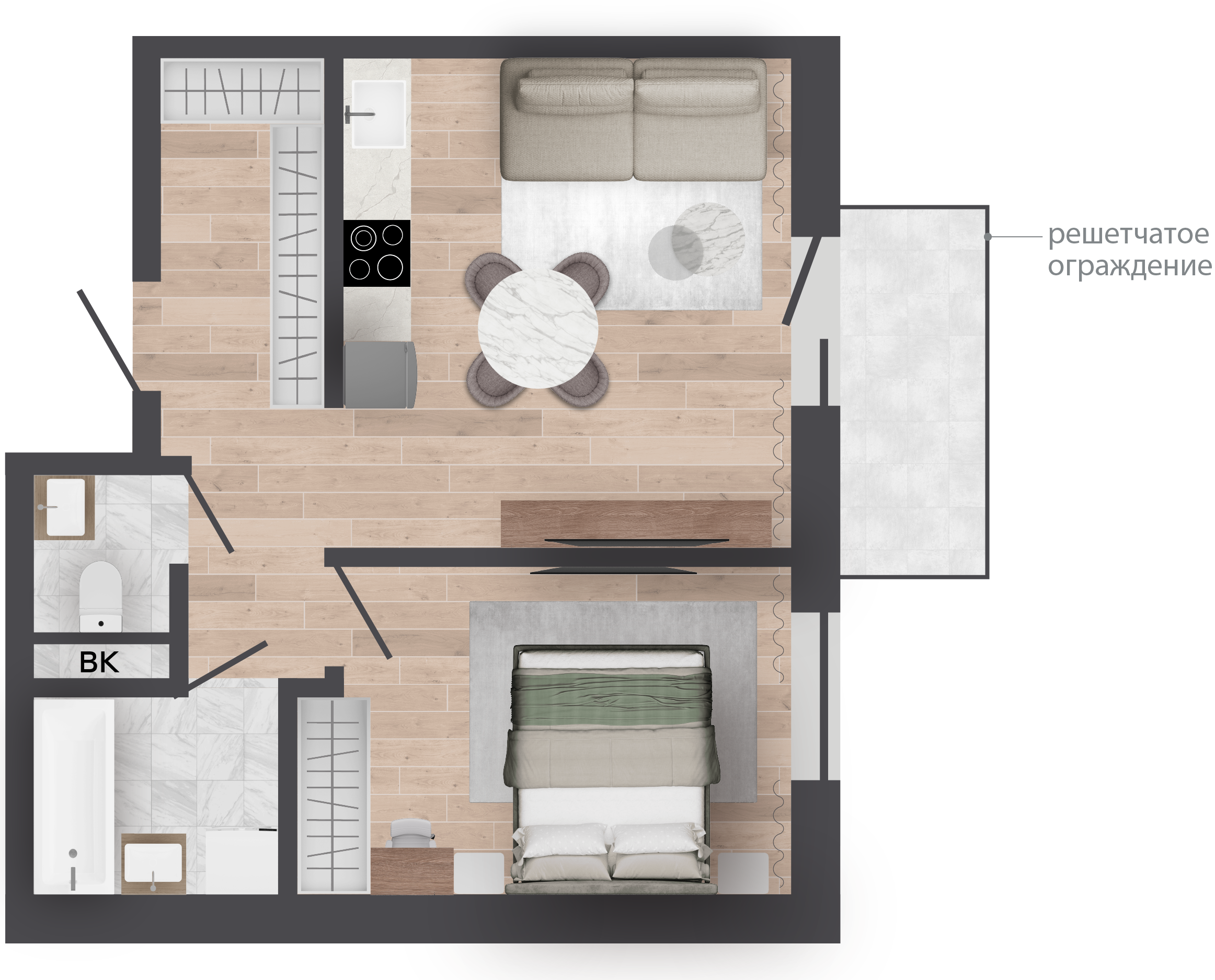 | 42,09 м² Площадь квартиры | 2,62 м Высота потолков | 500 мм Высота подоконной части |