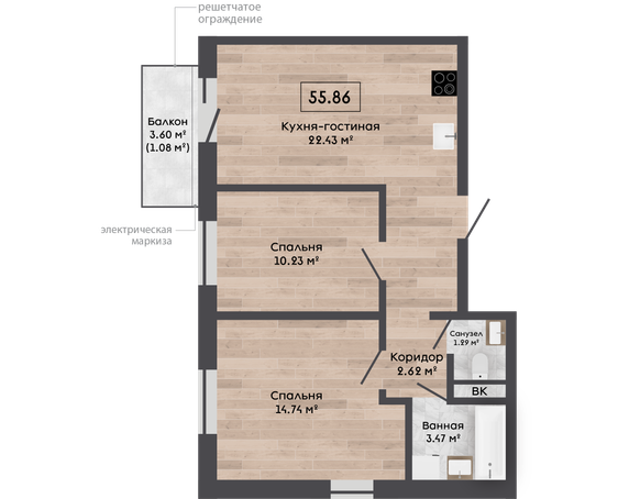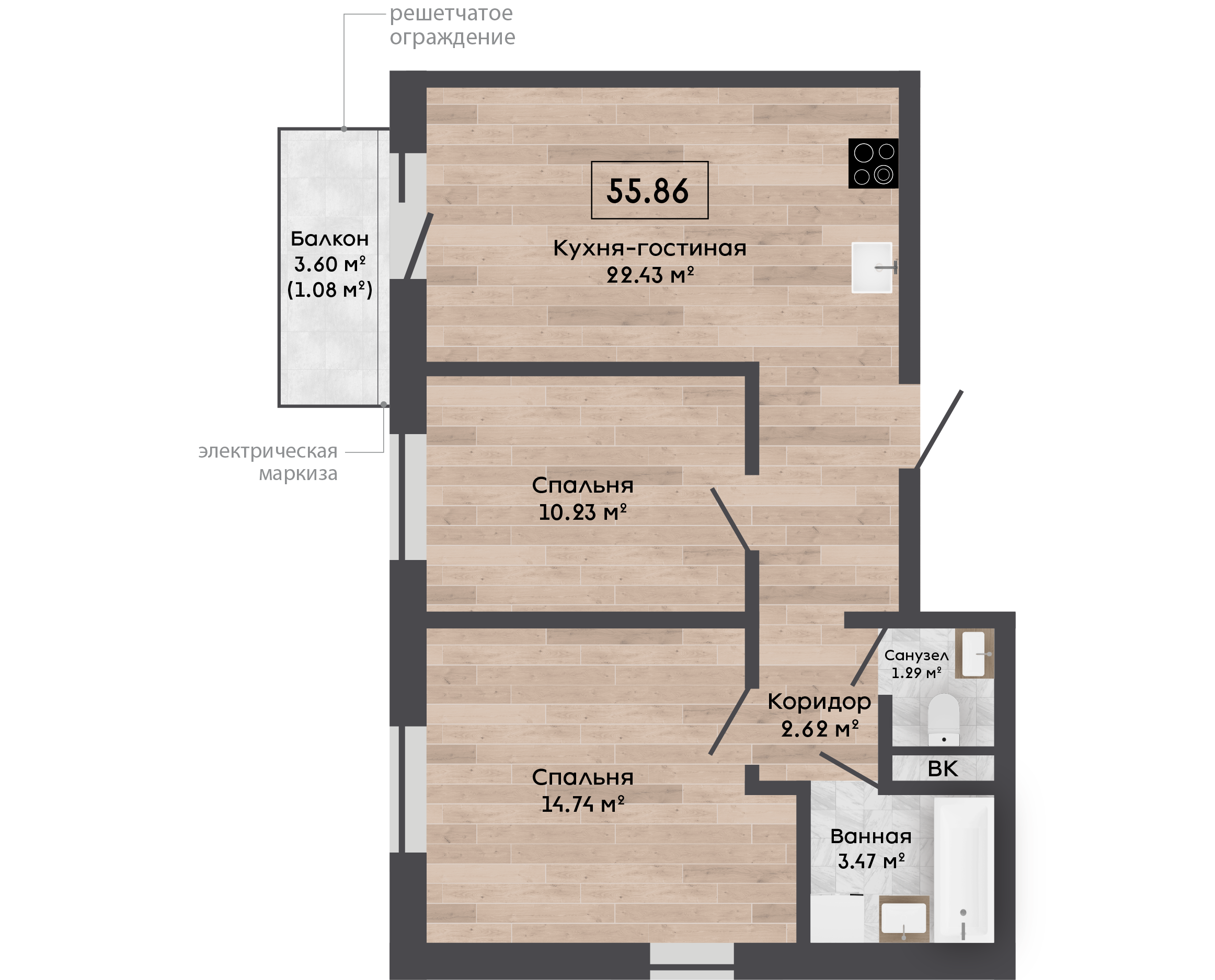 Обязательная покупка при приобретении квартиры| Площадь, м.кв. | 55.86 |