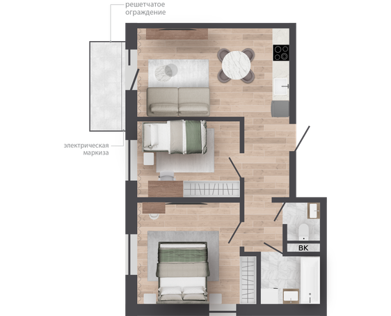| 55,86 м² Площадь квартиры | 2,62 м Высота потолков | 500 мм Высота подоконной части |