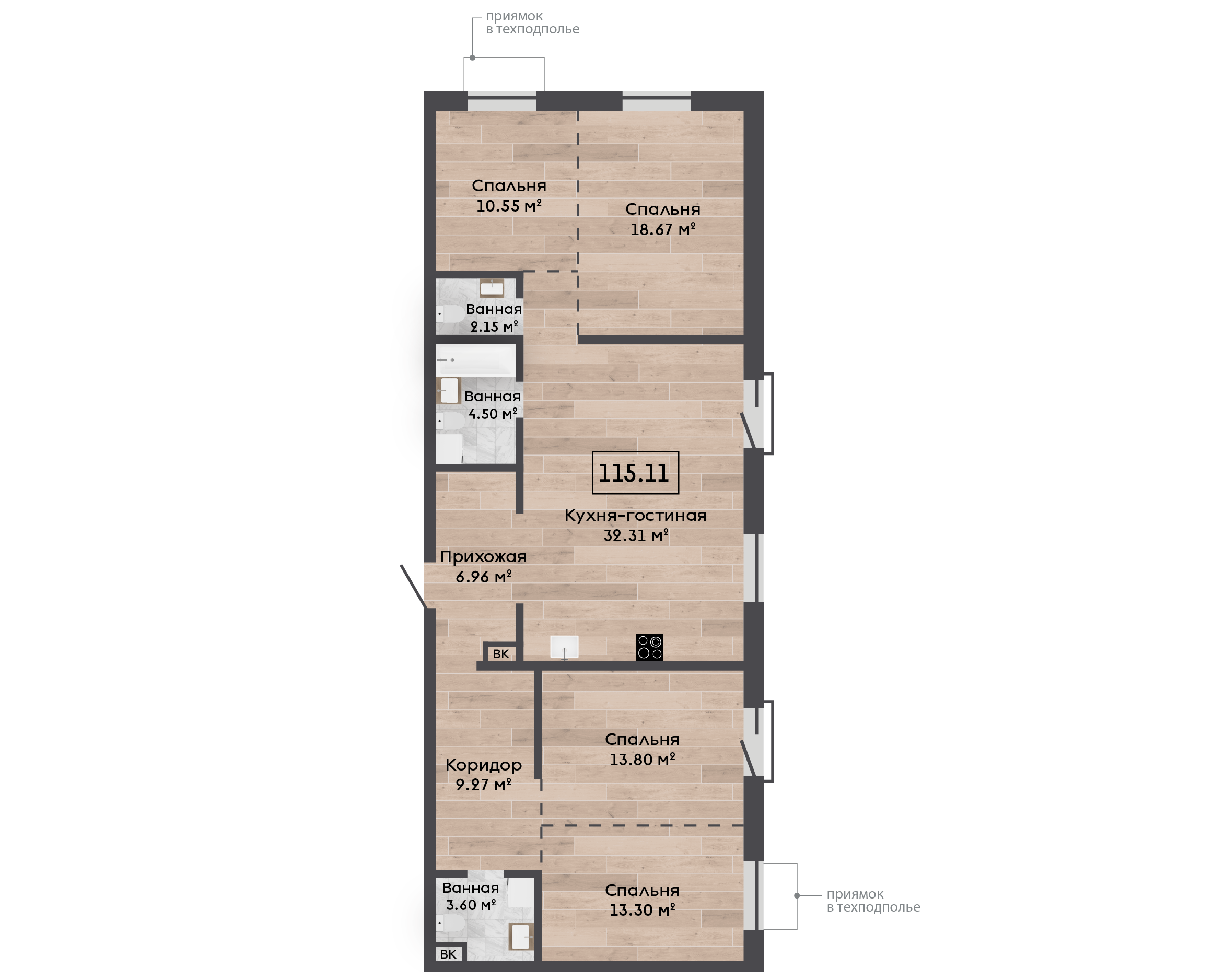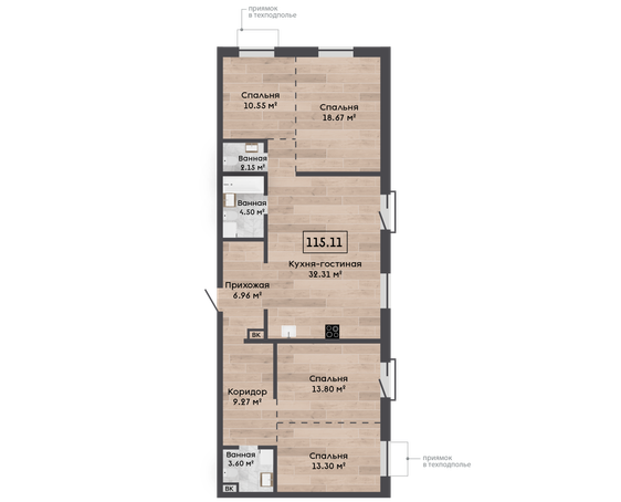 | 115,11 м² Площадь квартиры | 2,7 м Высота потолков | 470 мм Высота подоконной части |