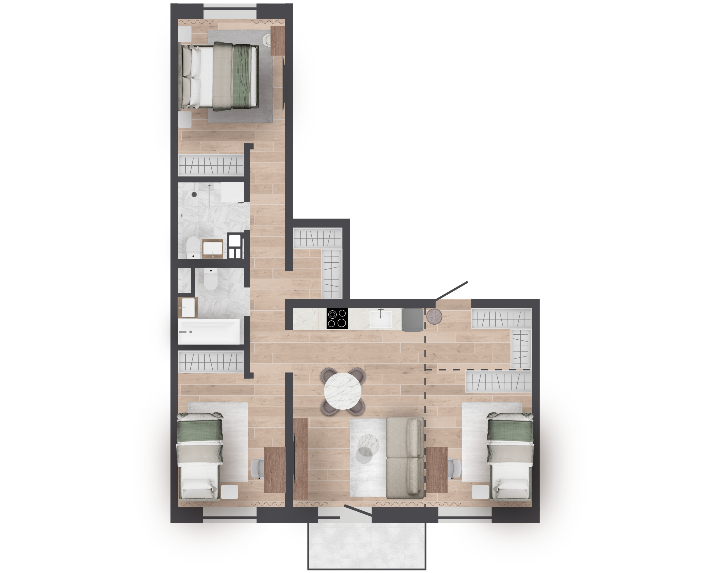 | 77,66 м² Площадь квартиры | 2,7 м Высота потолков | 500 мм Высота подоконной части |