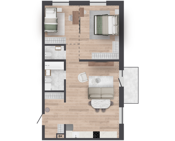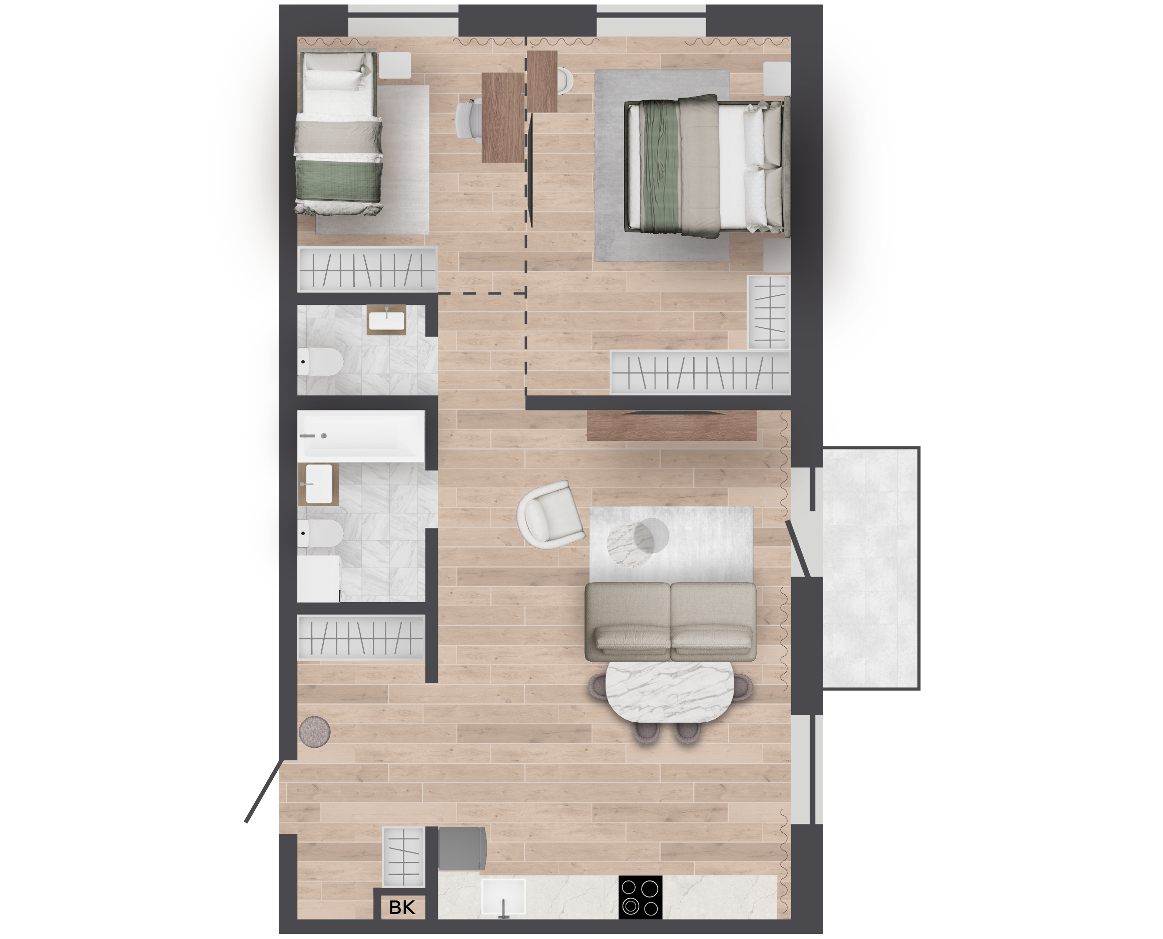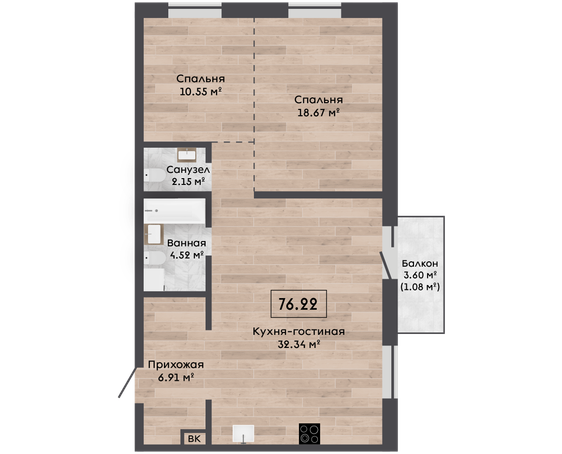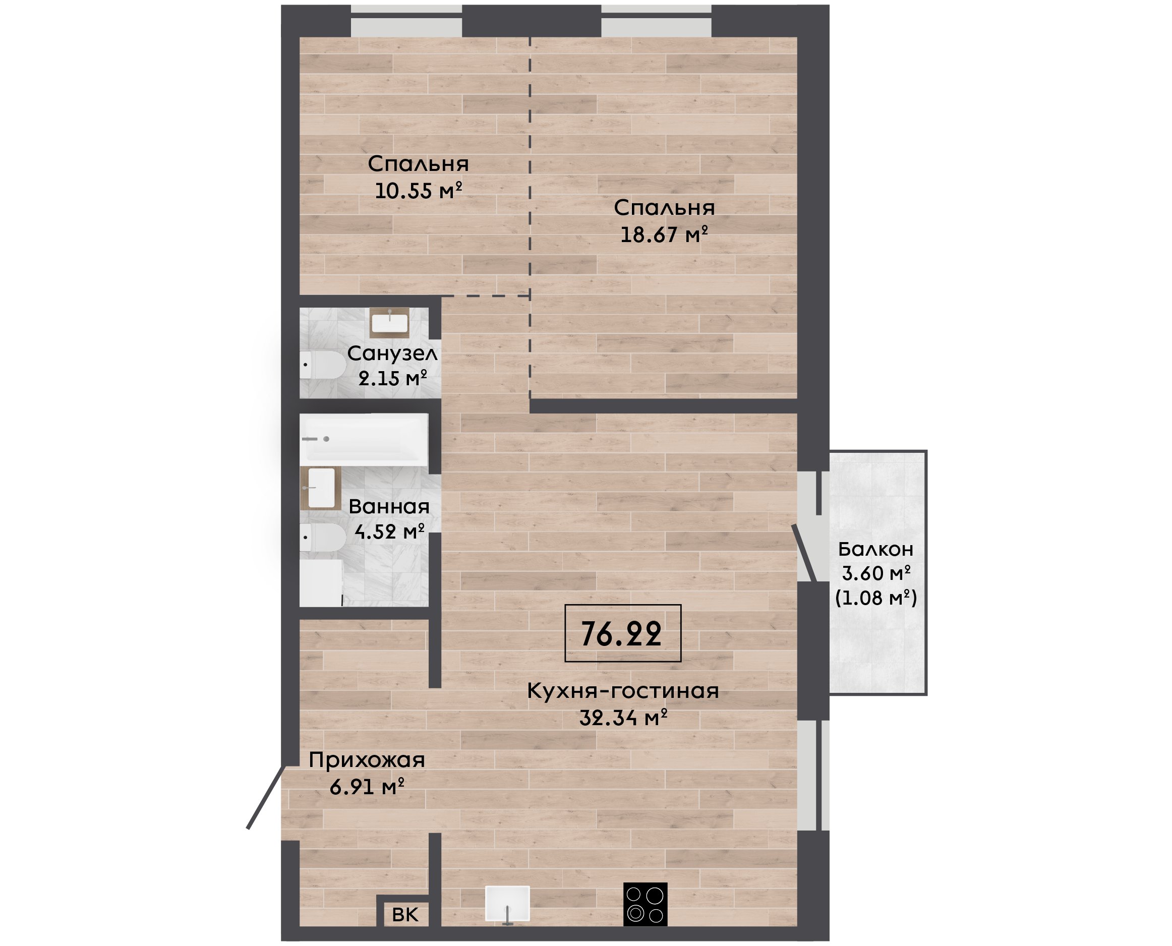 | 76,22 м² Площадь квартиры | 2,7 м Высота потолков | 500 мм Высота подоконной части |