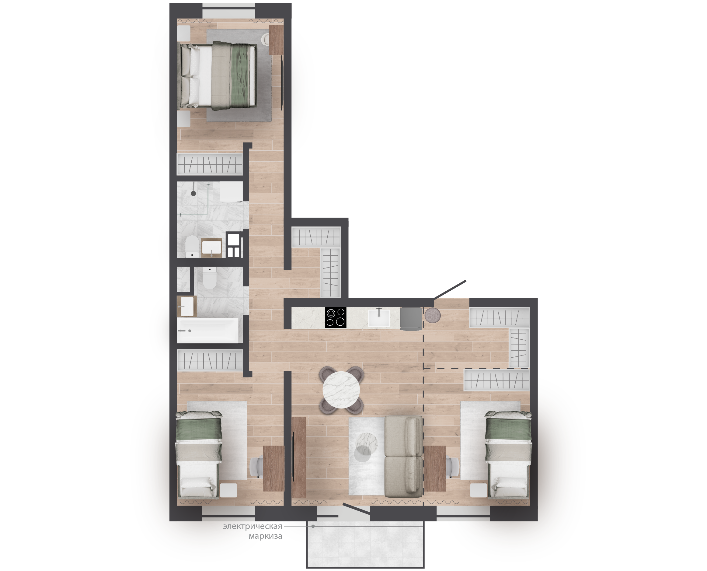 | 77,66 м² Площадь квартиры | 2,7 м Высота потолков | 500 мм Высота подоконной части |