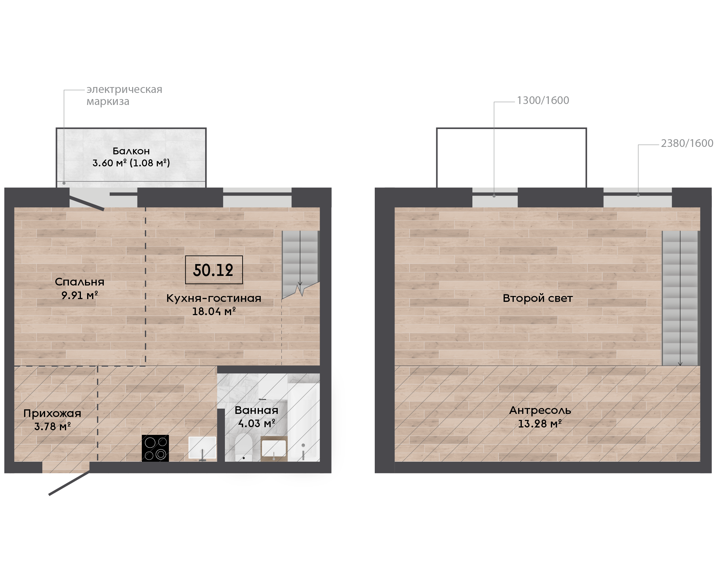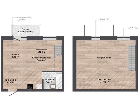 | 50,12 м² Площадь квартиры | до 7,19 м Высота потолков | 500 мм Высота подоконной части |
