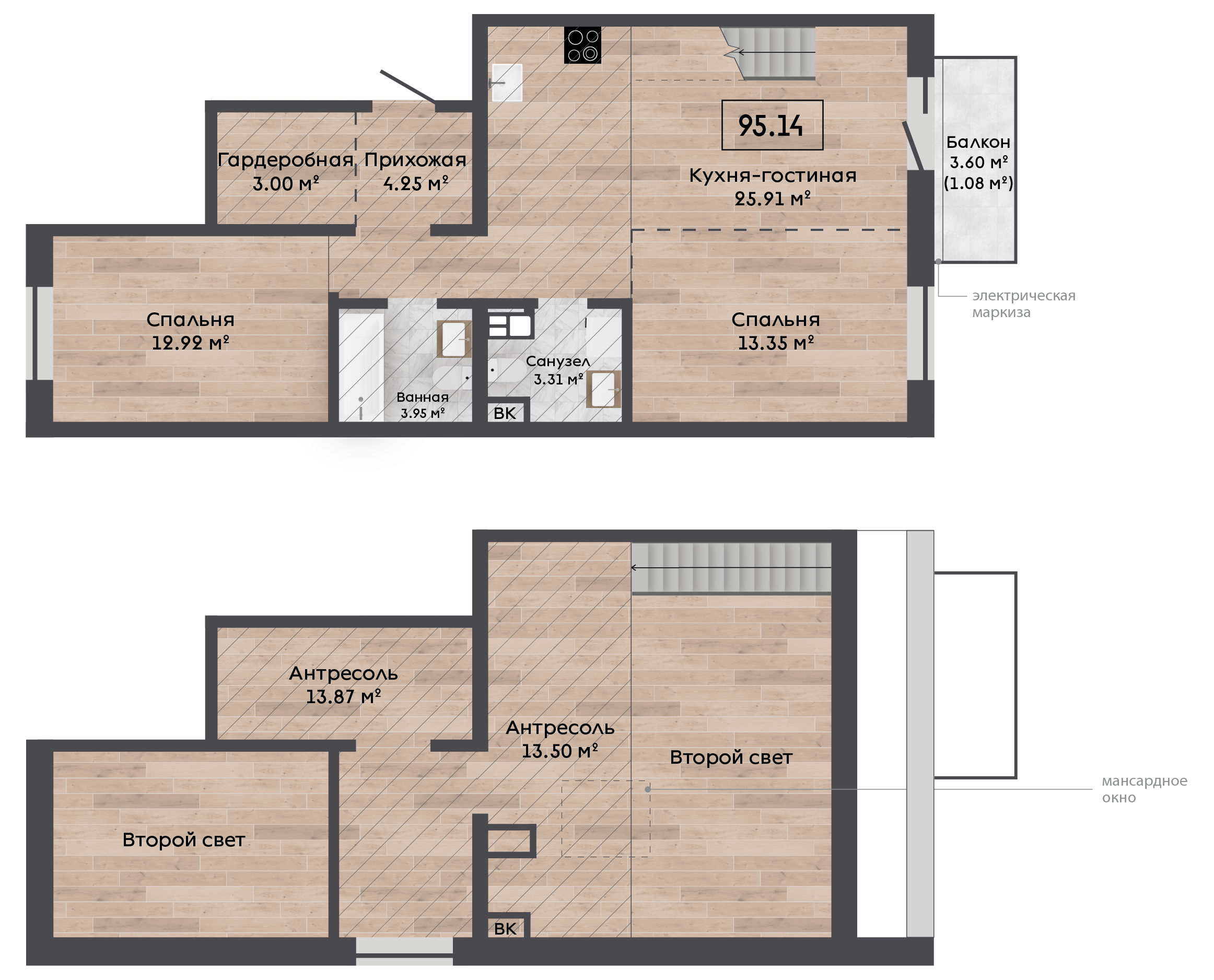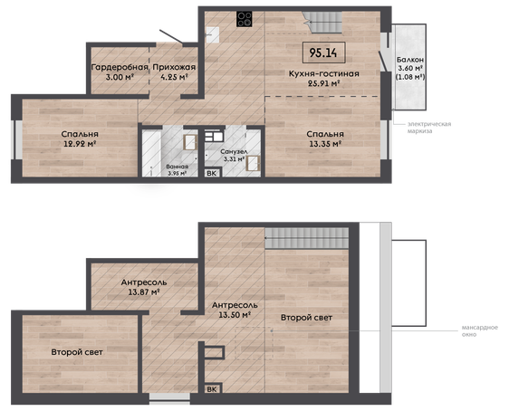 | 95,14 м² Площадь квартиры | до 7,19 м Высота потолков | 500 мм Высота подоконной части |