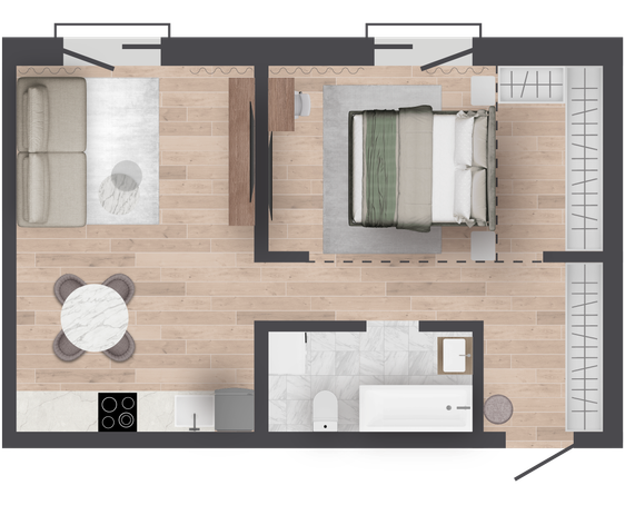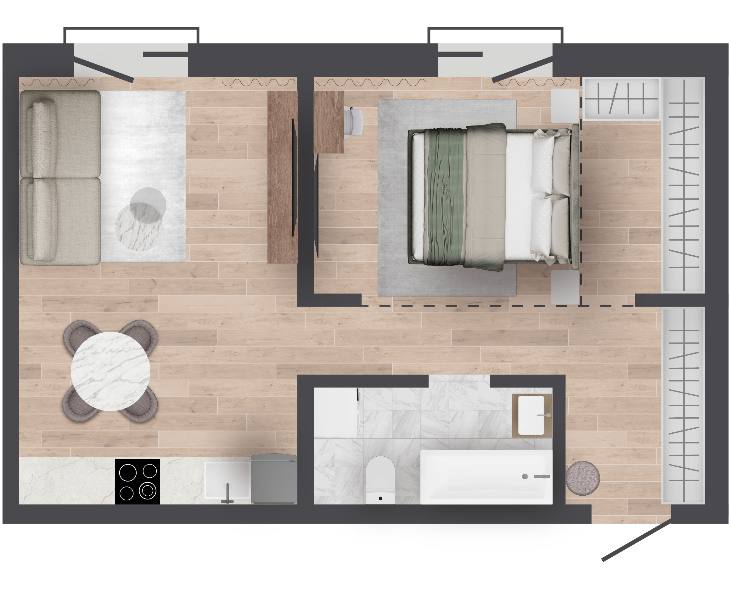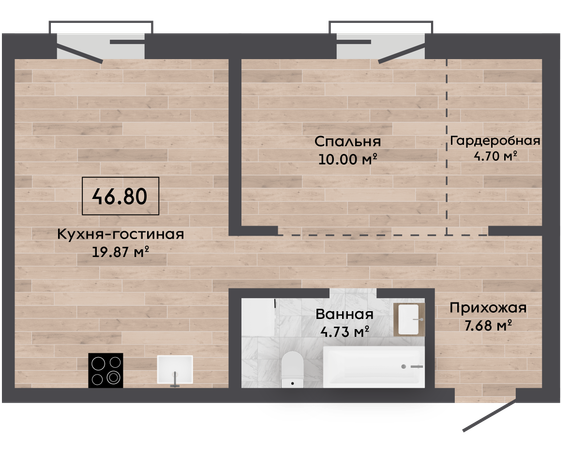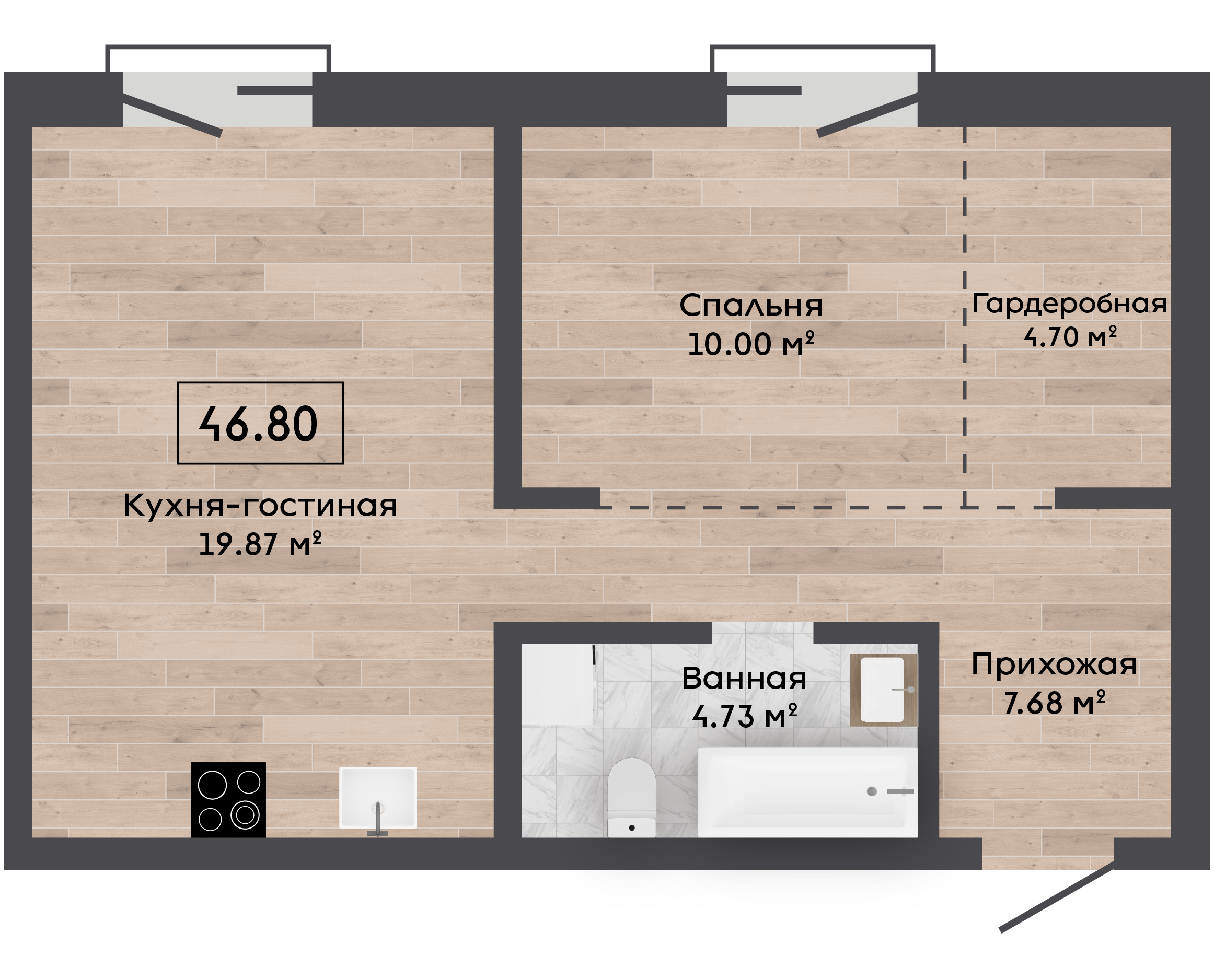 | 46,80 м² Площадь квартиры | 2,7 м Высота потолков | 470 мм Высота подоконной части |