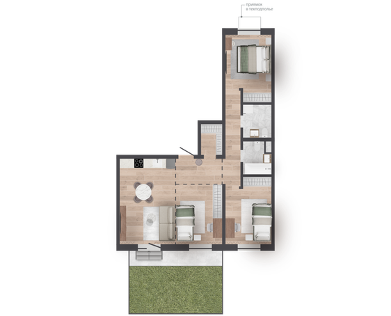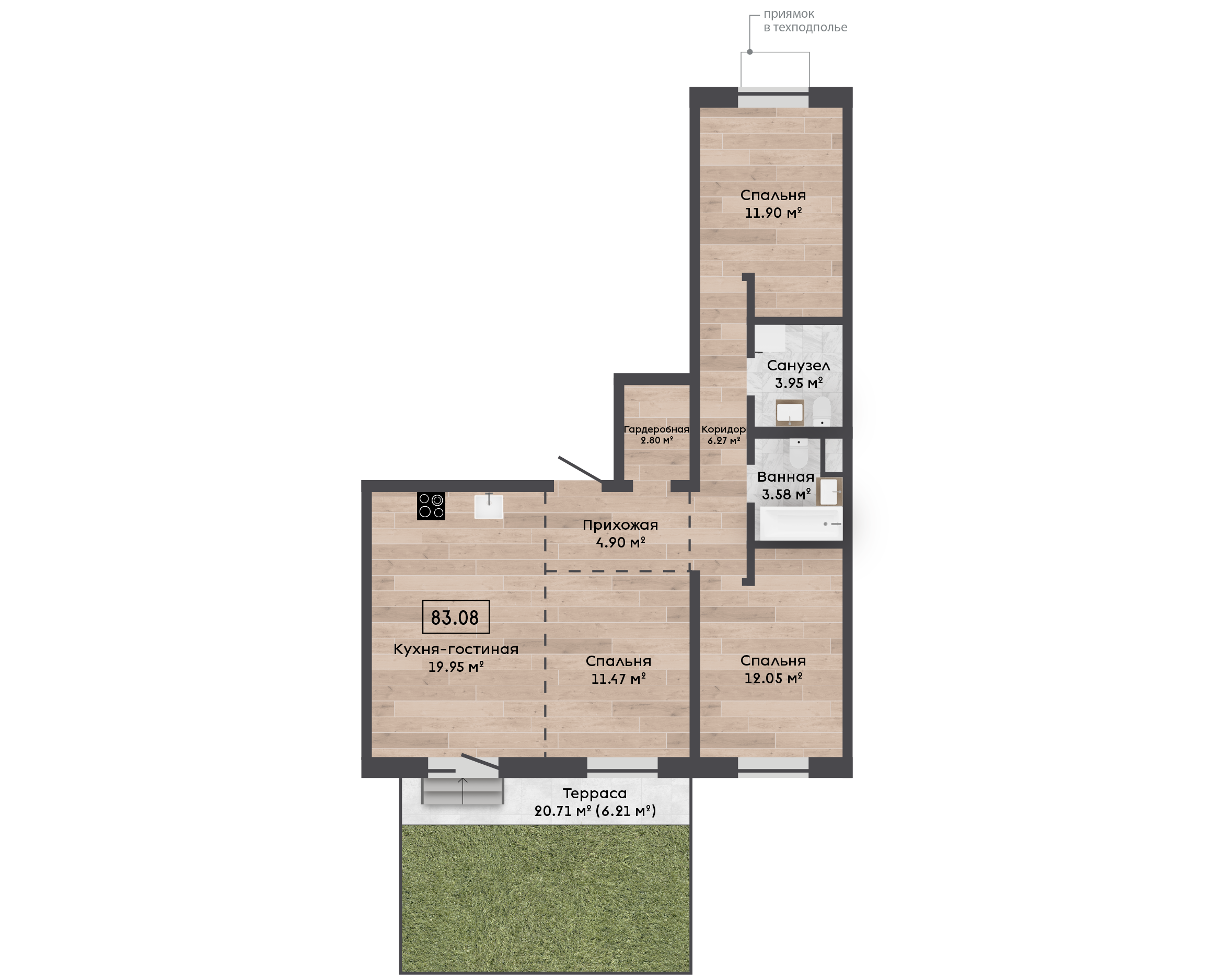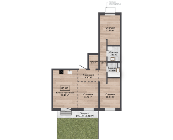 | 83,08 м² Площадь квартиры | 2,7 м Высота потолков | 20 м² Площадь участка |