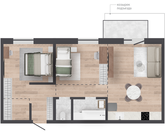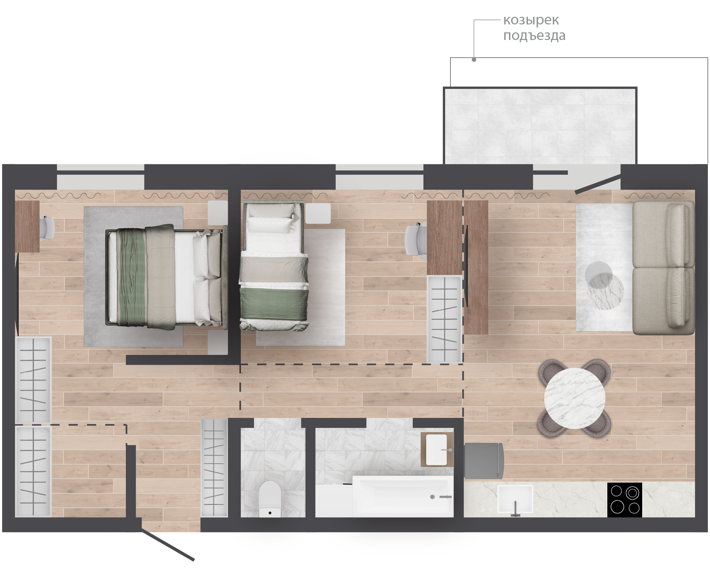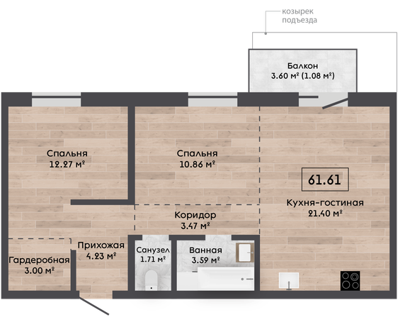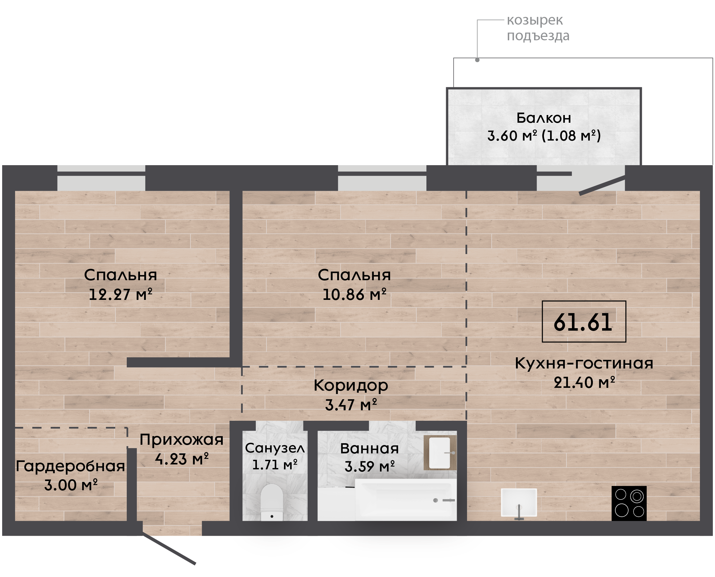 | 61,61 м² Площадь квартиры | 2,7 м Высота потолков | 500 мм Высота подоконной части |