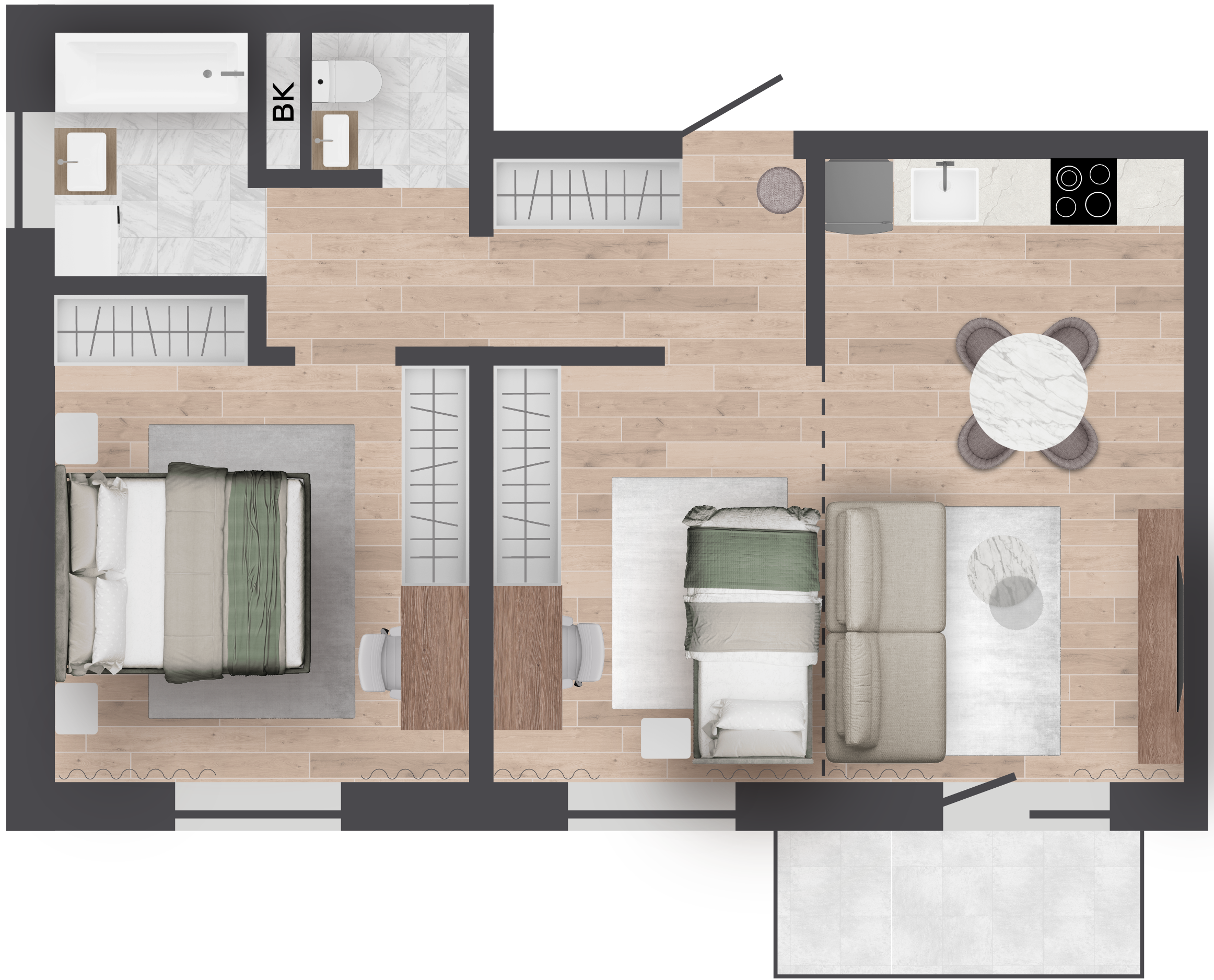 | 57,00 м² Площадь квартиры | 2,7 м Высота потолков | 500 мм Высота подоконной части |