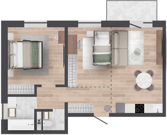 | 57,43 м² Площадь квартиры | 2,7 м Высота потолков | 500 мм Высота подоконной части |