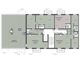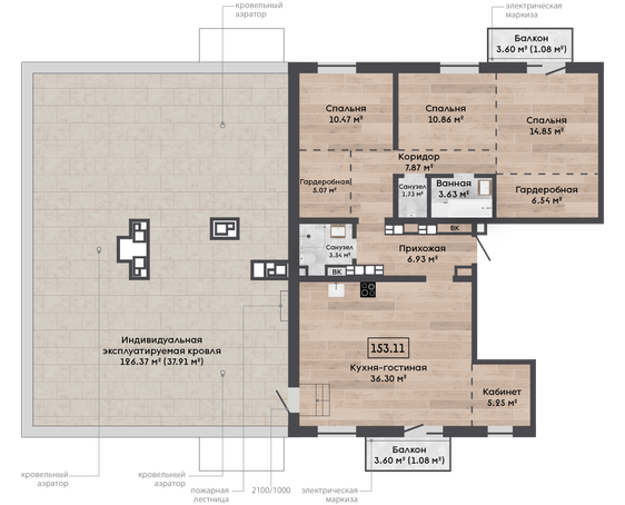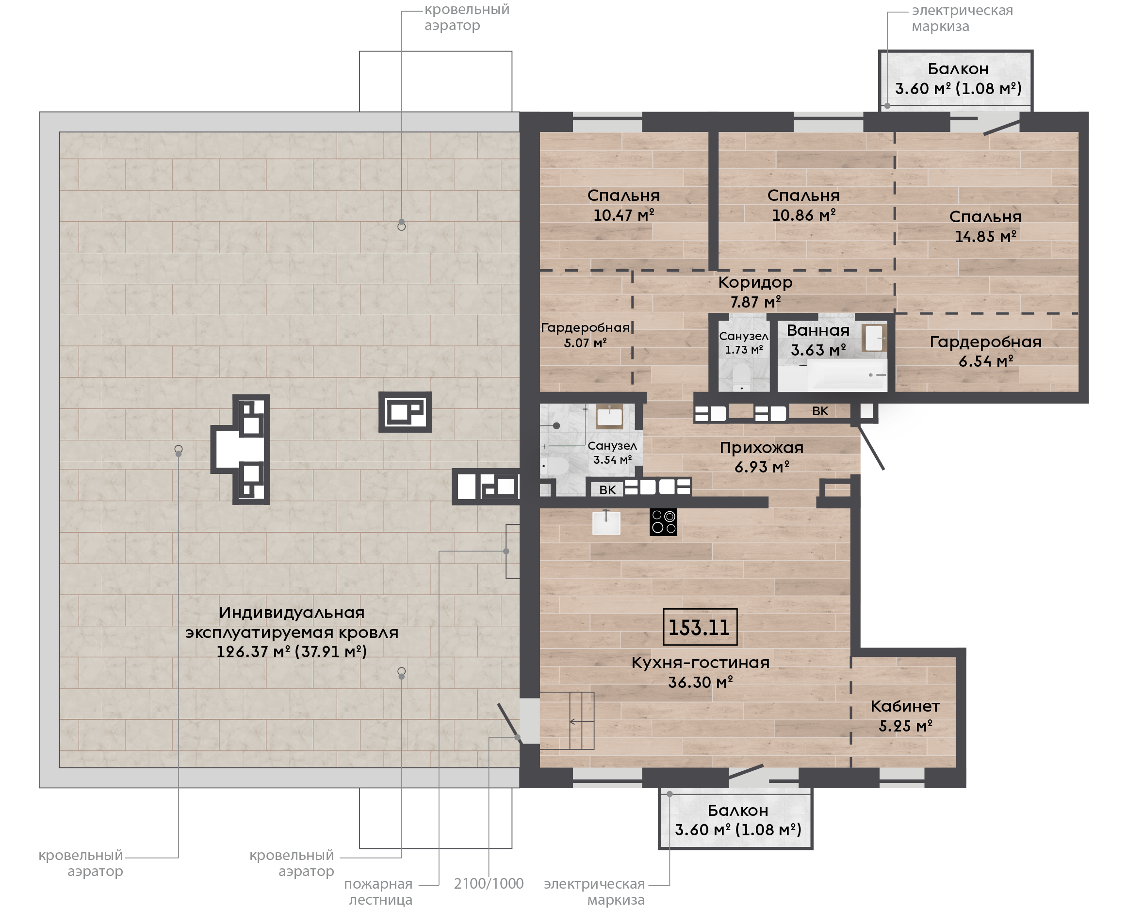 | 153,11 м² Площадь квартиры | 2,7 м Высота потолков | 126 м² Площадь террасы |