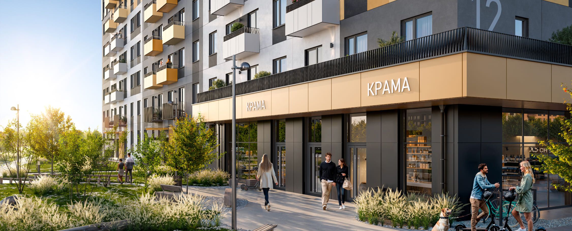 Территория, расположенная перед встроенными коммерческими помещениями, будет размещать зоны отдыха, оборудованные уличной мебелью: стульями, столиками, скамейками и велопарковками. Территория отдыха будет отделена зоной озеленения, перекрывающей вид от транзитные пути.