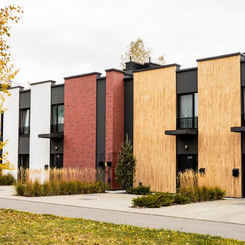 Благоустройство делится на территорию общественную и участки, примыкающие к каждой квартире. На общих территориях предусмотрены тротуары к дому и озеленение. Комплексное озеленение территории выполнено деревьями, кустарниками и многолетними травянистыми растениями. Предусмотрено освещение проездов и тротуаров. По периметру квартала и между группами домов предусмотрено максимальное сохранение зеленых насаждений, в зоне которых прокладывается прогулочная тропа.
