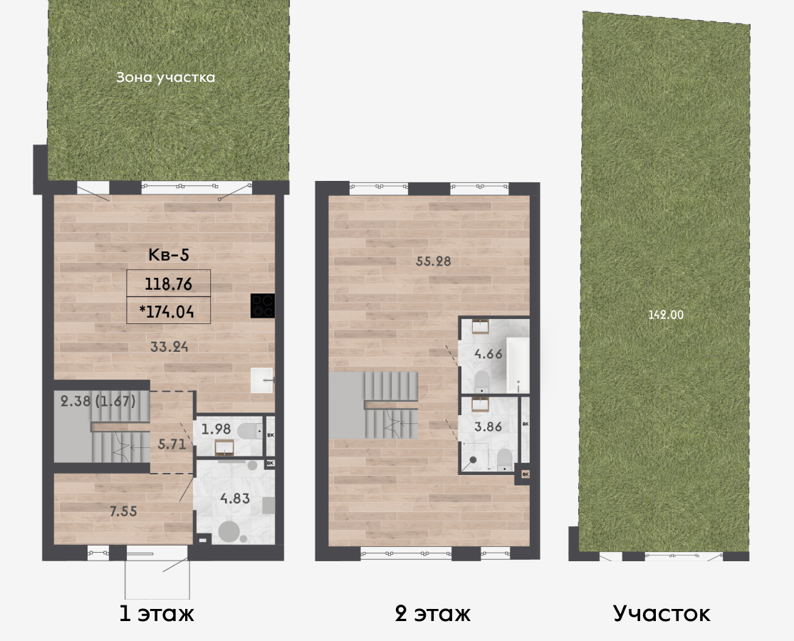 | 118,76 м² Площадь квартиры | 142 м² Площадь участка | 55,28 м² Площадь бонус-этажа |